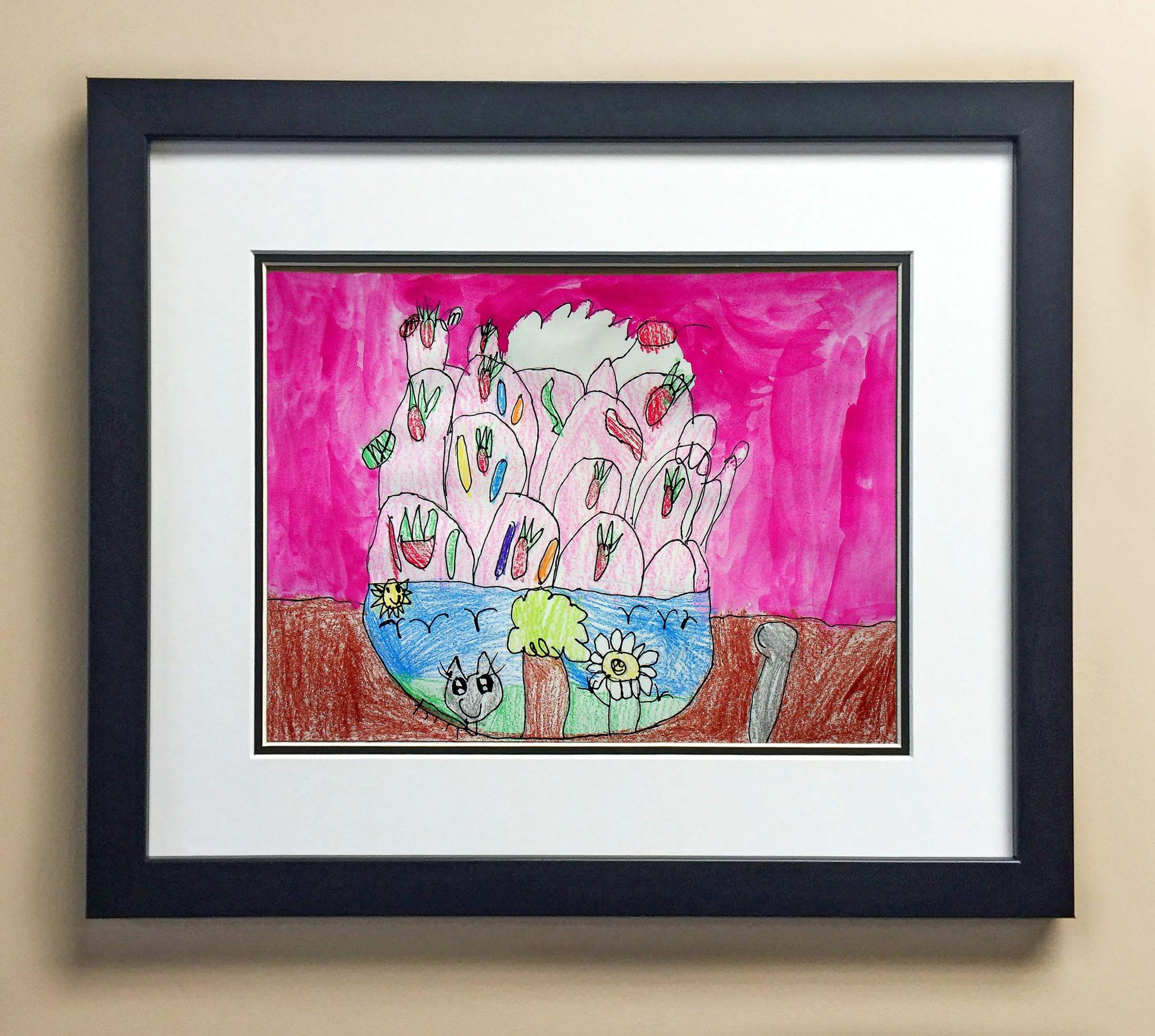 Included with the purchase is the Students Artwork, Frame, double matboard, shatter proof plexiglass, and a ready to hang backerboard with turnbuttons