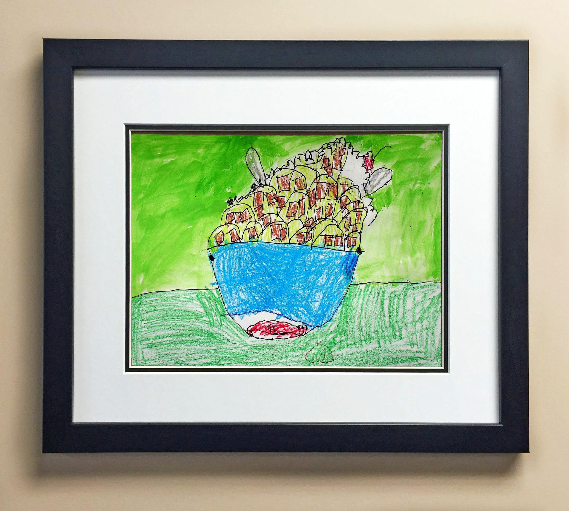 Included with the purchase is the Students Artwork, Frame, double matboard, shatter proof plexiglass, and a ready to hang backerboard with turnbuttons
