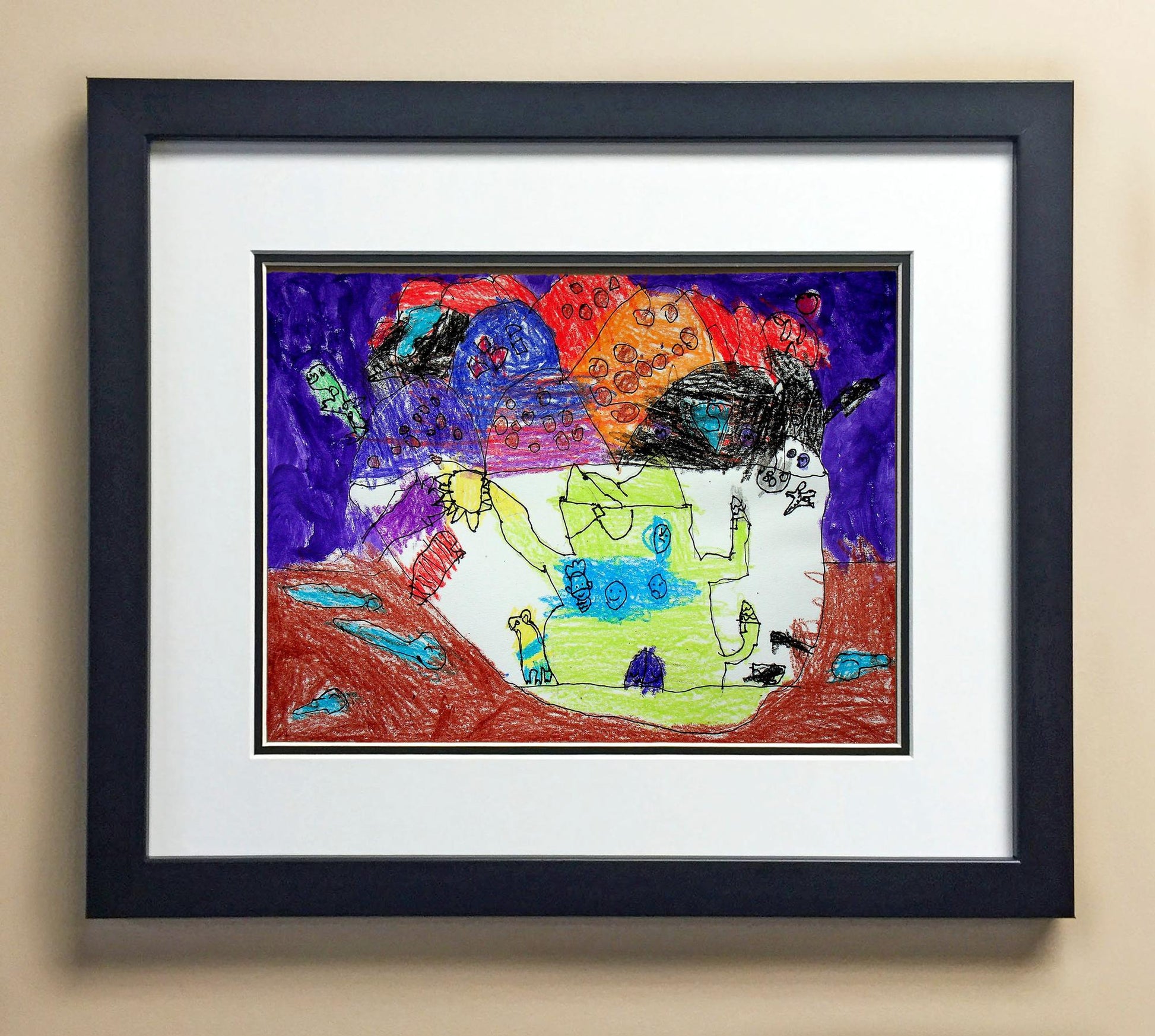 Included with the purchase is the Students Artwork, Frame, double matboard, shatter proof plexiglass, and a ready to hang backerboard with turnbuttons