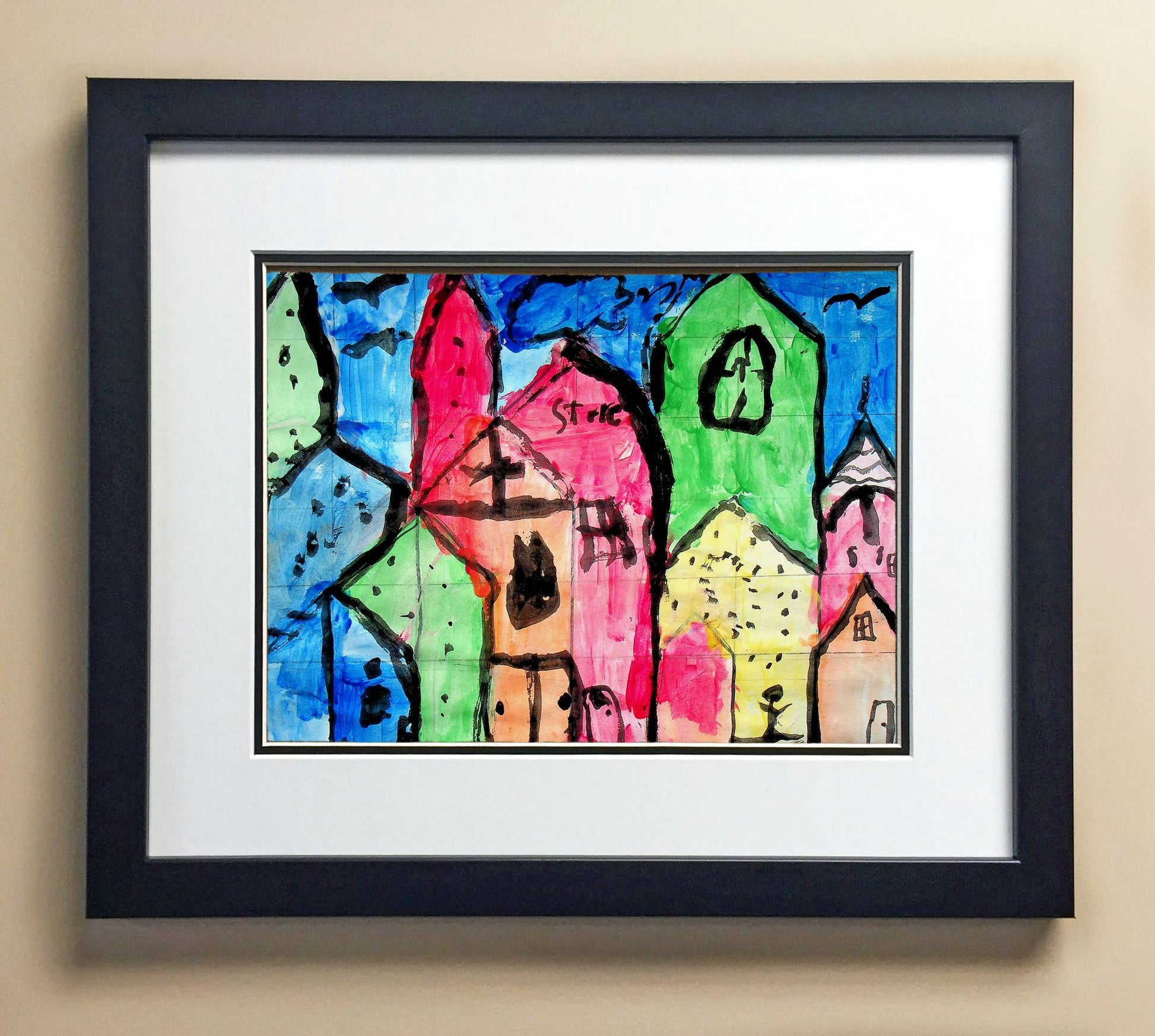 Included with the purchase is the Students Artwork, Frame, double matboard, shatter proof plexiglass, and a ready to hang backerboard with turnbuttons