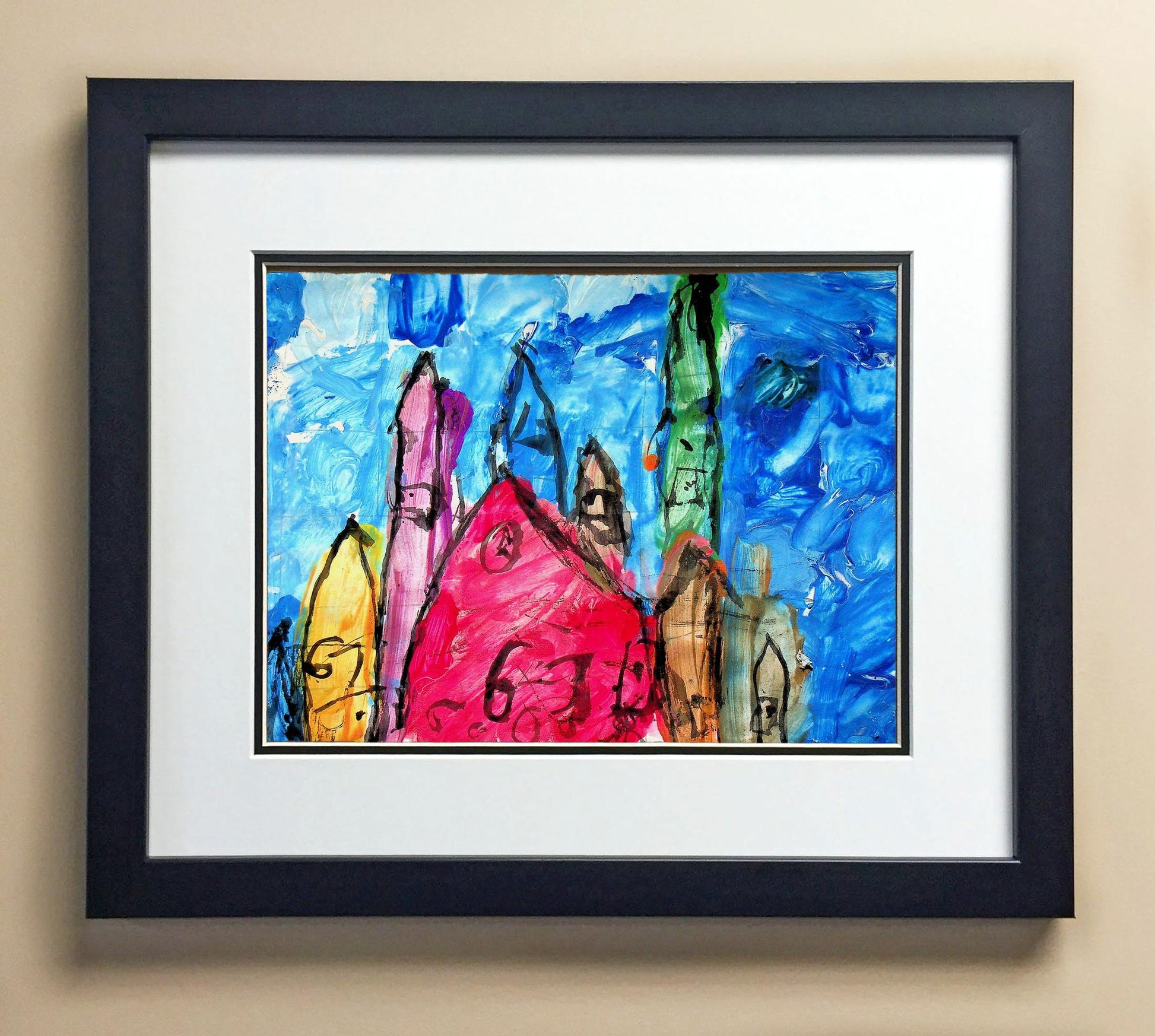 Included with the purchase is the Students Artwork, Frame, double matboard, shatter proof plexiglass, and a ready to hang backerboard with turnbuttons