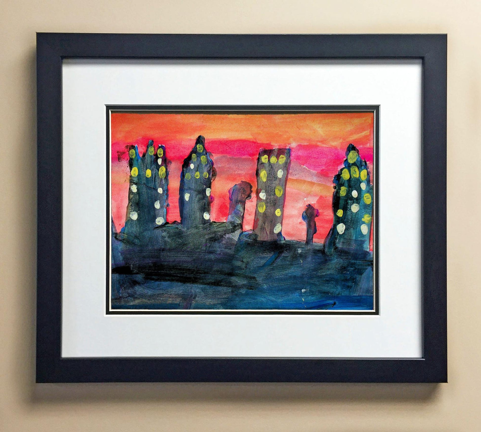 Included with the purchase is the Students Artwork, Frame, double matboard, shatter proof plexiglass, and a ready to hang backerboard with turnbuttons