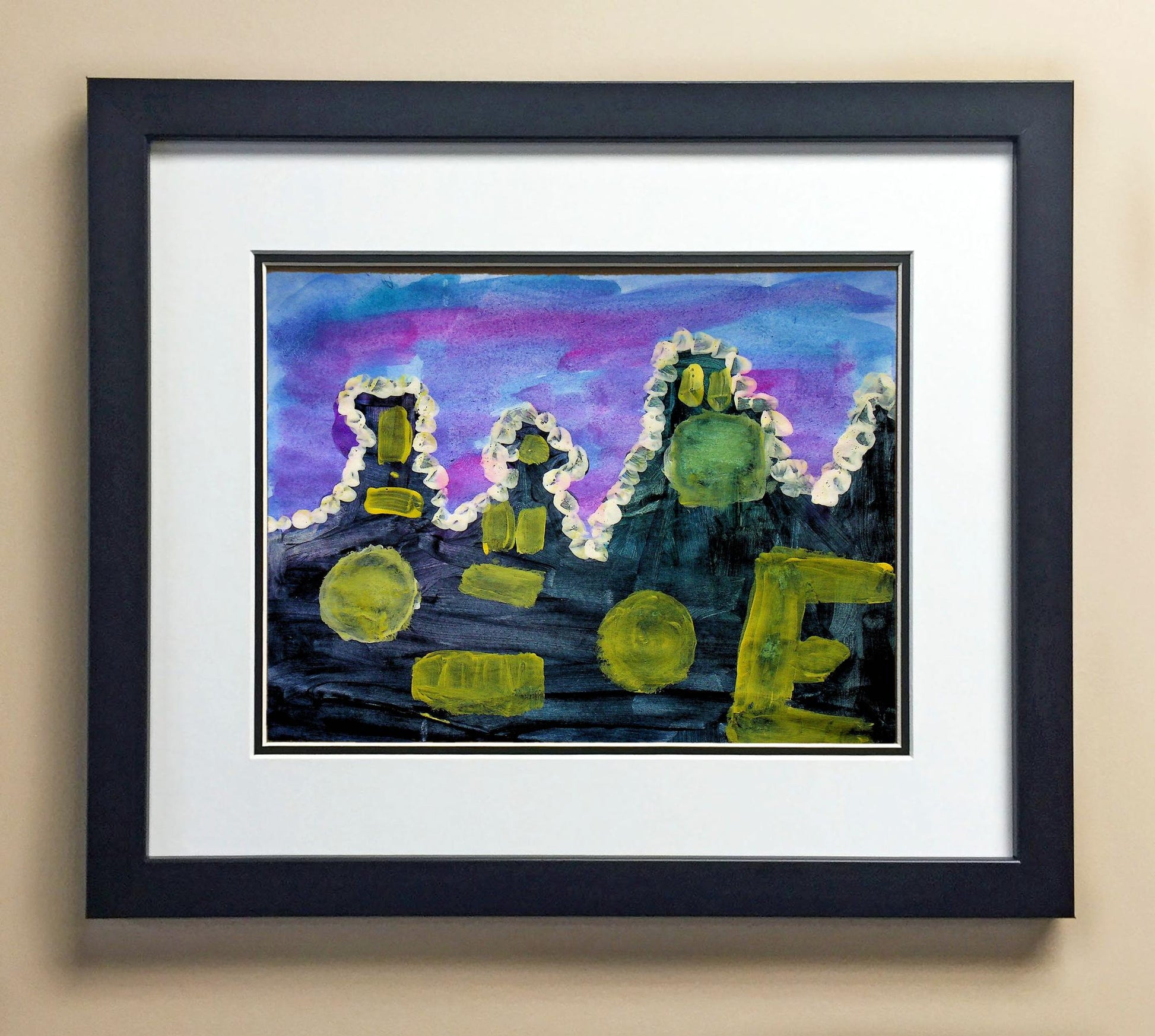 Included with the purchase is the Students Artwork, Frame, double matboard, shatter proof plexiglass, and a ready to hang backerboard with turnbuttons