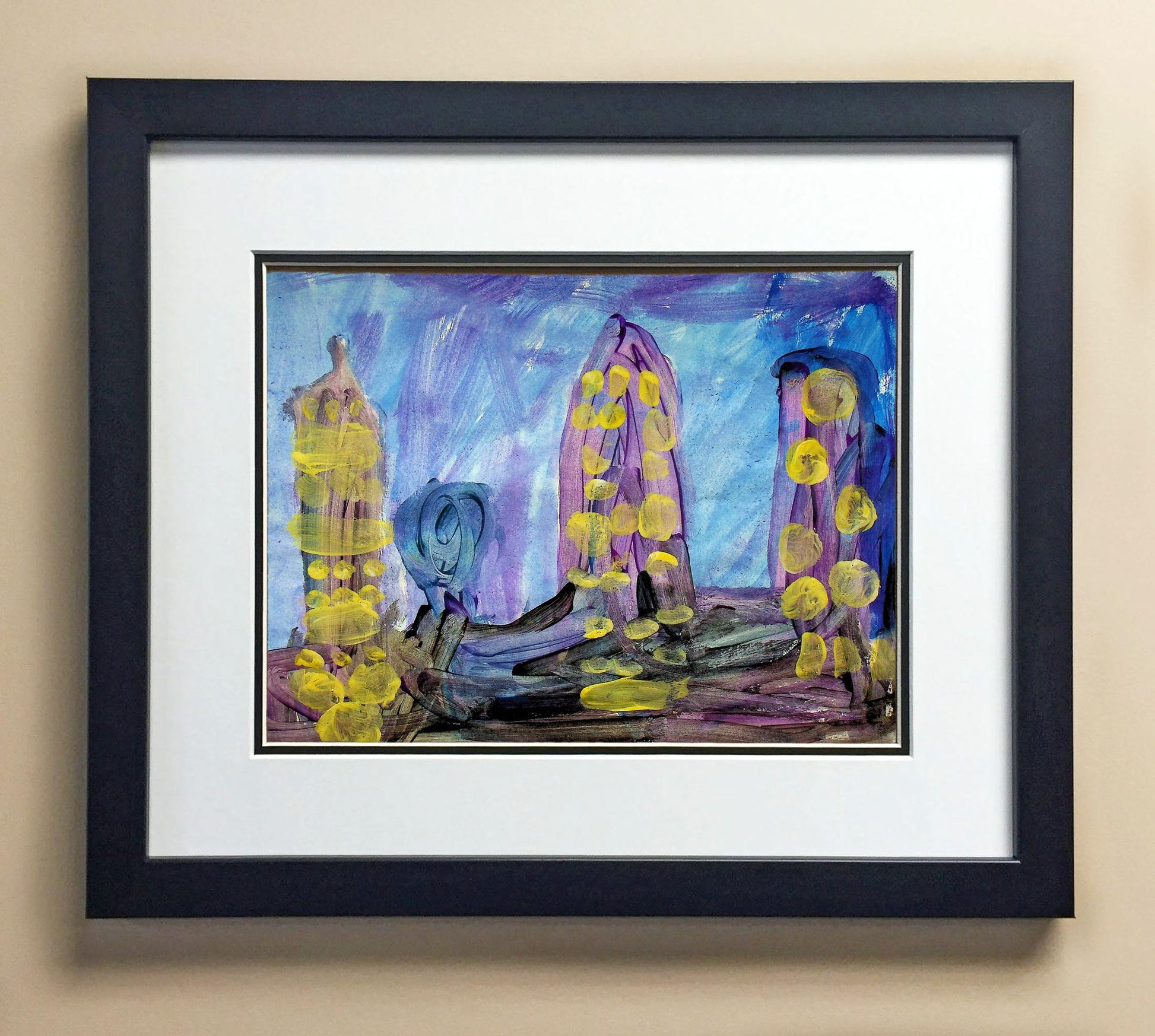 Included with the purchase is the Students Artwork, Frame, double matboard, shatter proof plexiglass, and a ready to hang backerboard with turnbuttons
