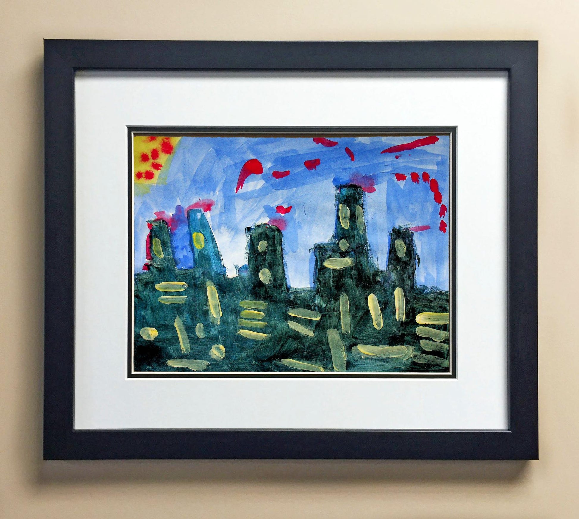 Included with the purchase is the Students Artwork, Frame, double matboard, shatter proof plexiglass, and a ready to hang backerboard with turnbuttons