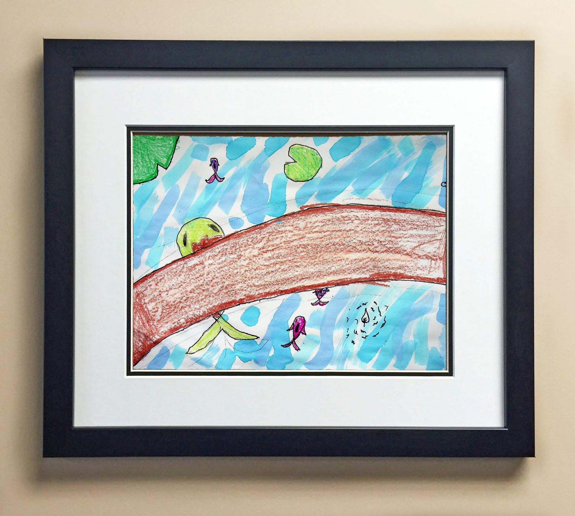 Included with the purchase is the Students Artwork, Frame, double matboard, shatter proof plexiglass, and a ready to hang backerboard with turnbuttons