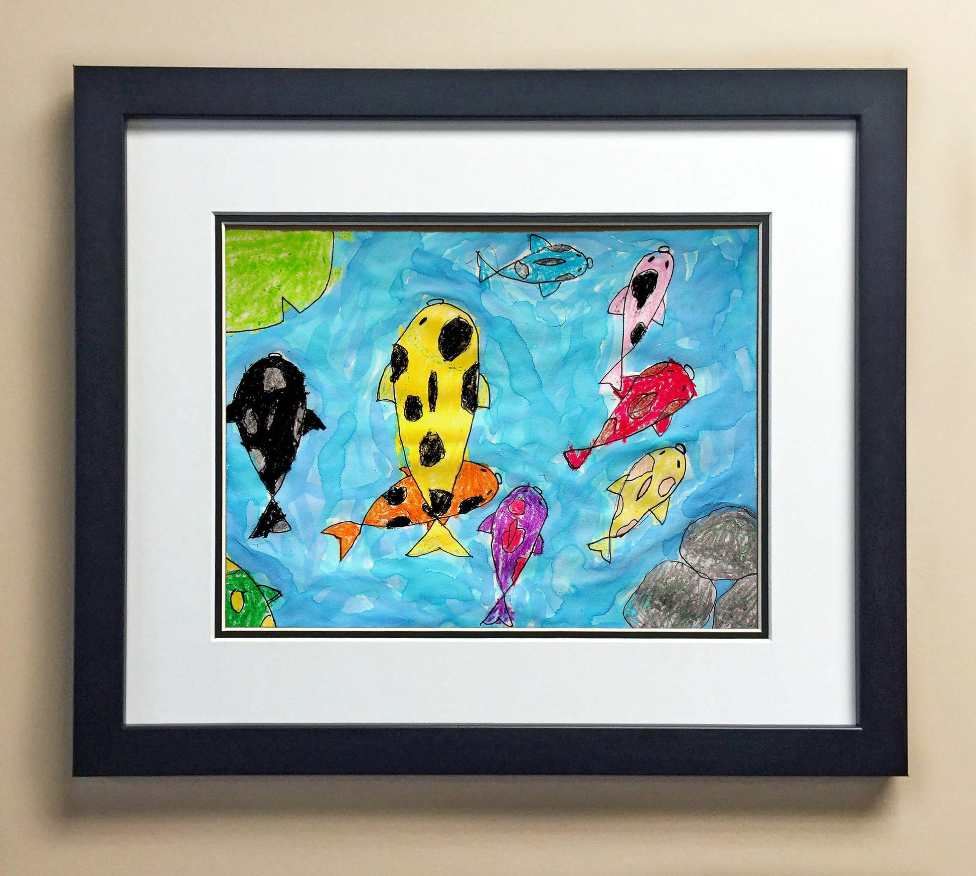 Included with the purchase is the Students Artwork, Frame, double matboard, shatter proof plexiglass, and a ready to hang backerboard with turnbuttons