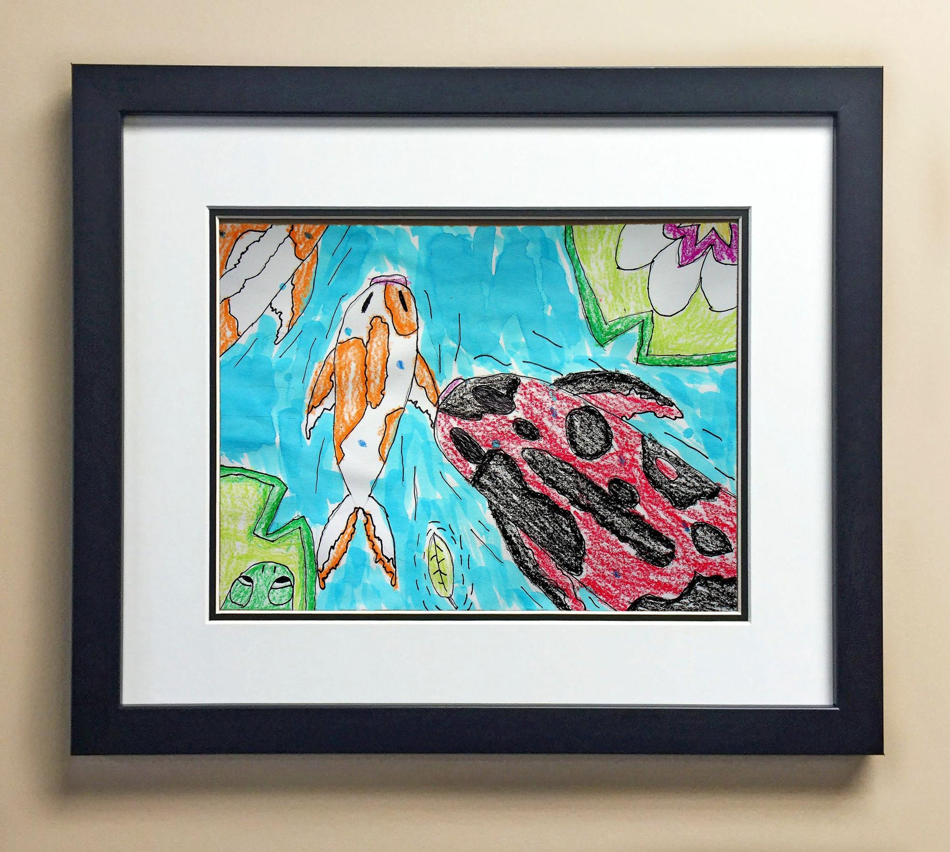 Included with the purchase is the Students Artwork, Frame, double matboard, shatter proof plexiglass, and a ready to hang backerboard with turnbuttons