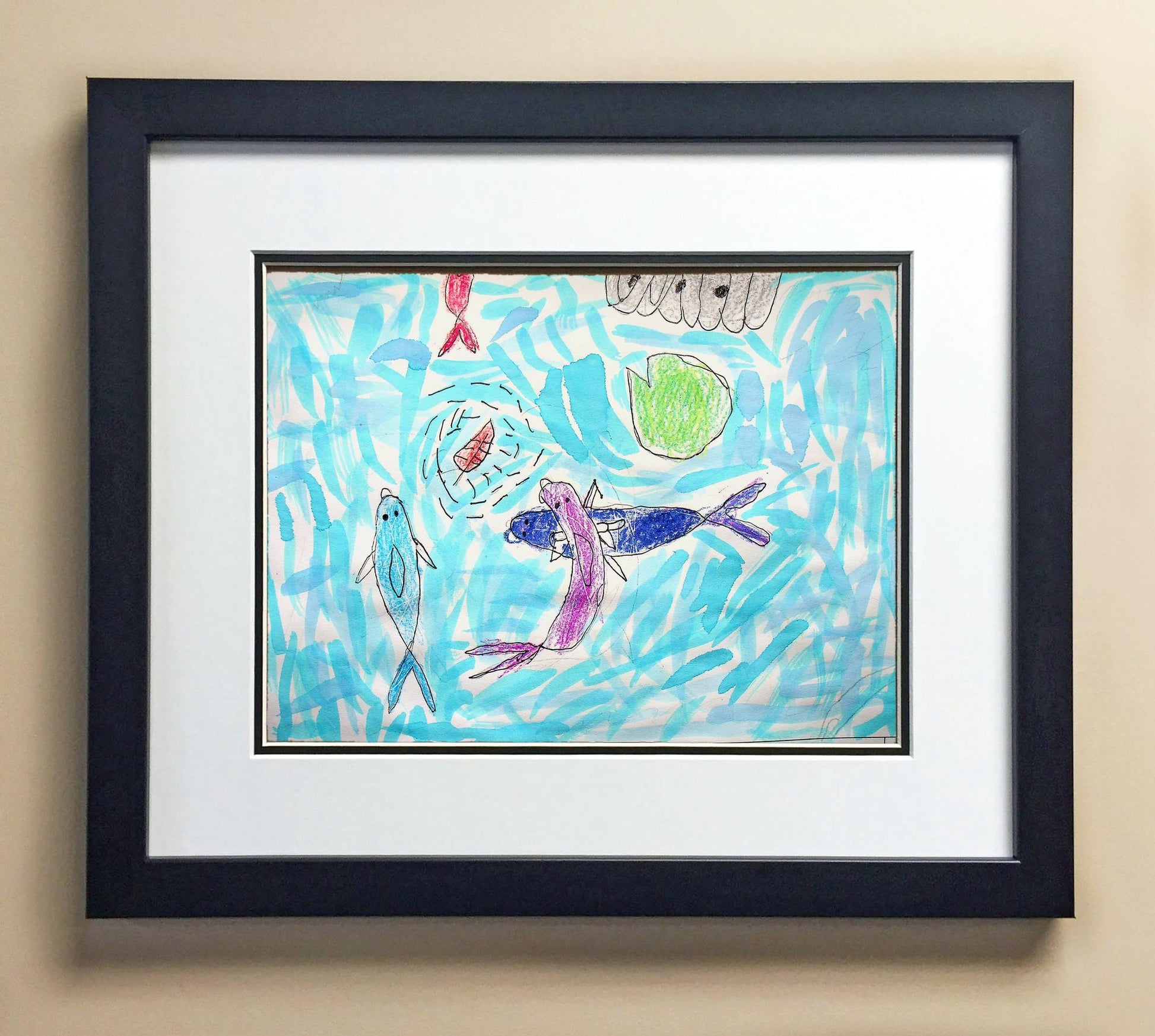 Included with the purchase is the Students Artwork, Frame, double matboard, shatter proof plexiglass, and a ready to hang backerboard with turnbuttons