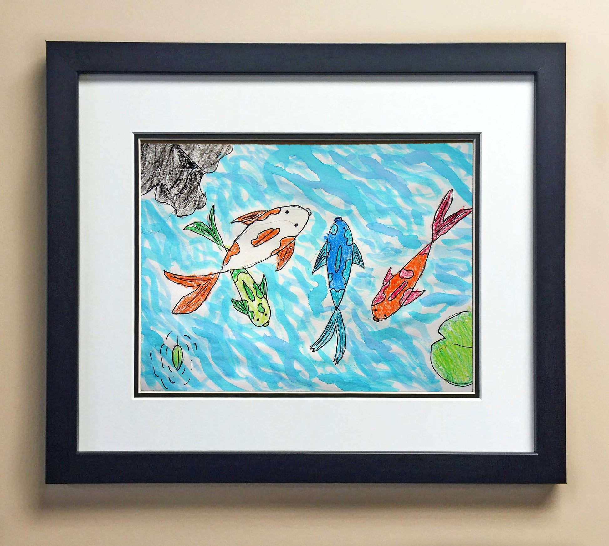 Included with the purchase is the Students Artwork, Frame, double matboard, shatter proof plexiglass, and a ready to hang backerboard with turnbuttons