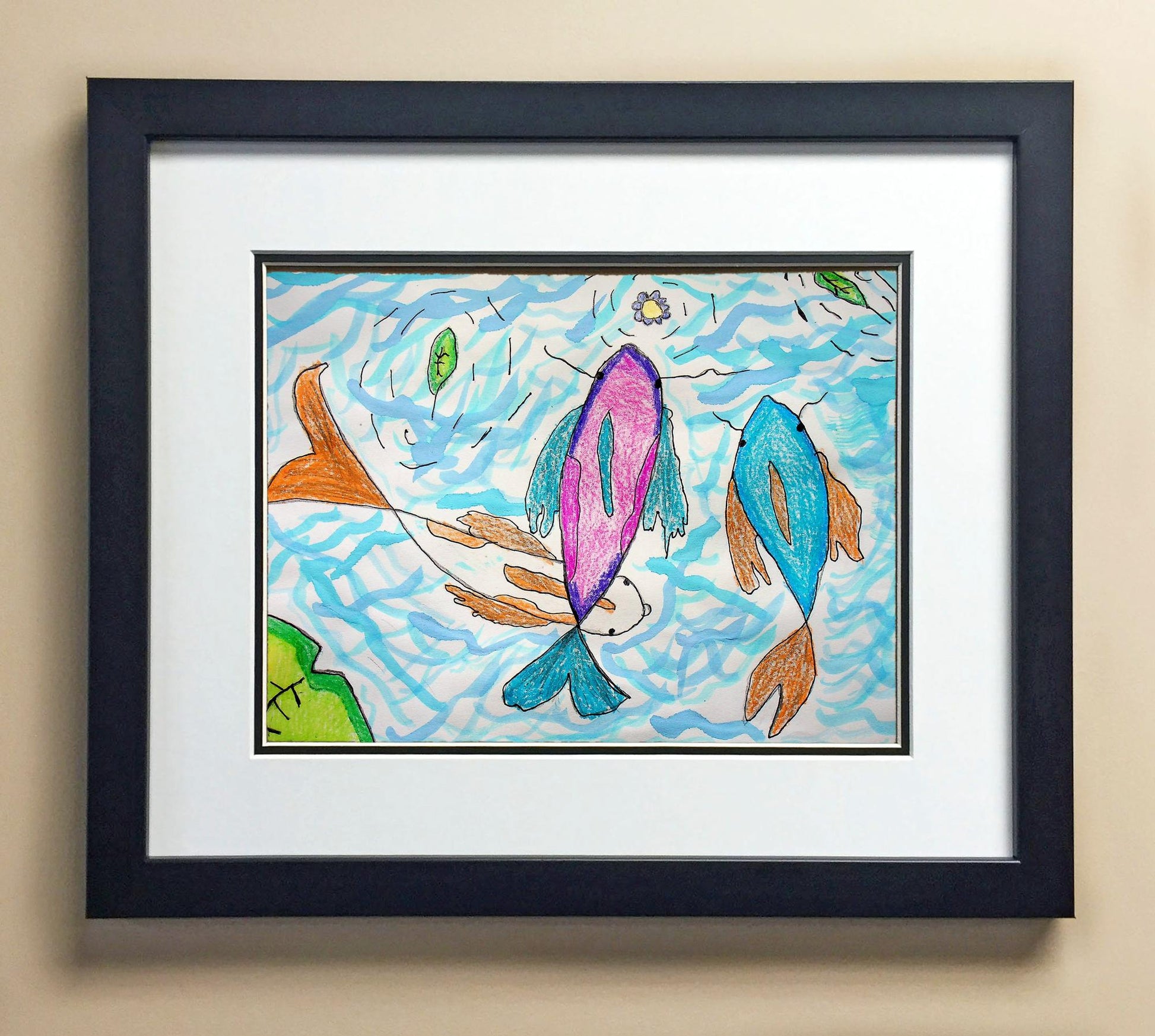 Included with the purchase is the Students Artwork, Frame, double matboard, shatter proof plexiglass, and a ready to hang backerboard with turnbuttons