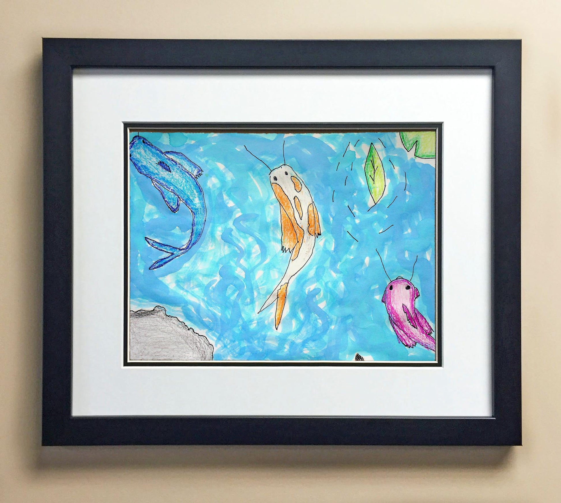 Included with the purchase is the Students Artwork, Frame, double matboard, shatter proof plexiglass, and a ready to hang backerboard with turnbuttons
