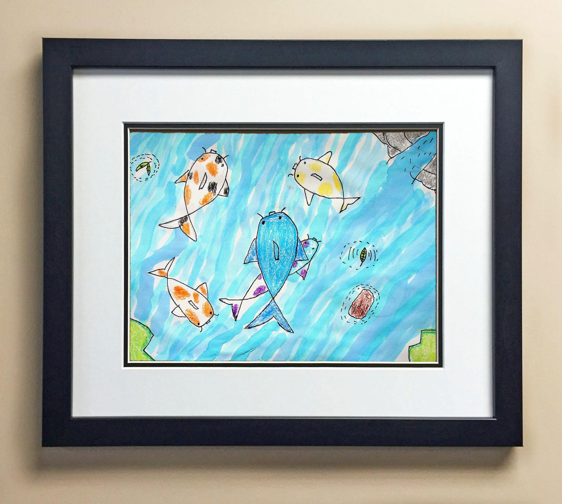 Included with the purchase is the Students Artwork, Frame, double matboard, shatter proof plexiglass, and a ready to hang backerboard with turnbuttons