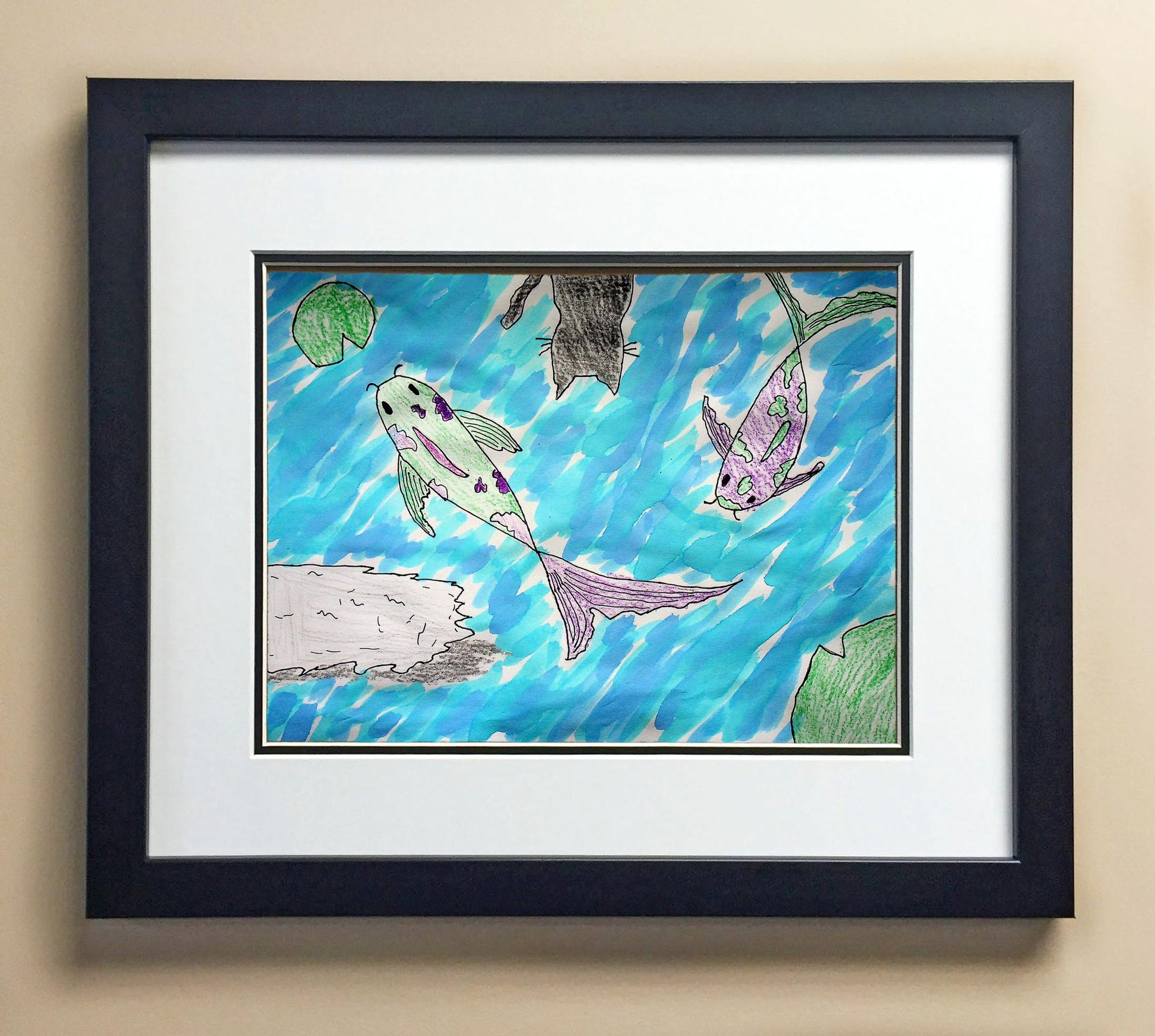 Included with the purchase is the Students Artwork, Frame, double matboard, shatter proof plexiglass, and a ready to hang backerboard with turnbuttons