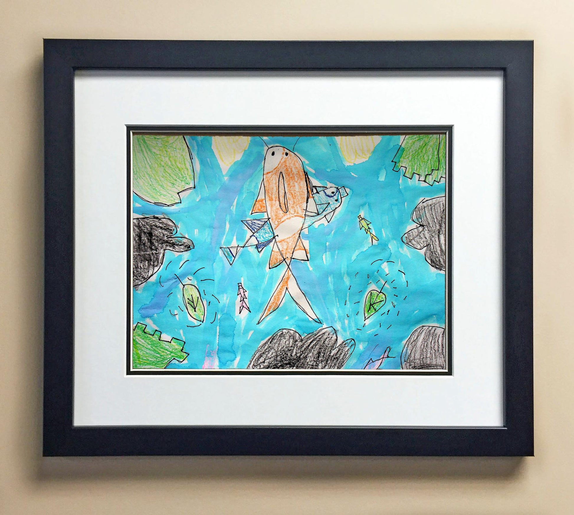 Included with the purchase is the Students Artwork, Frame, double matboard, shatter proof plexiglass, and a ready to hang backerboard with turnbuttons