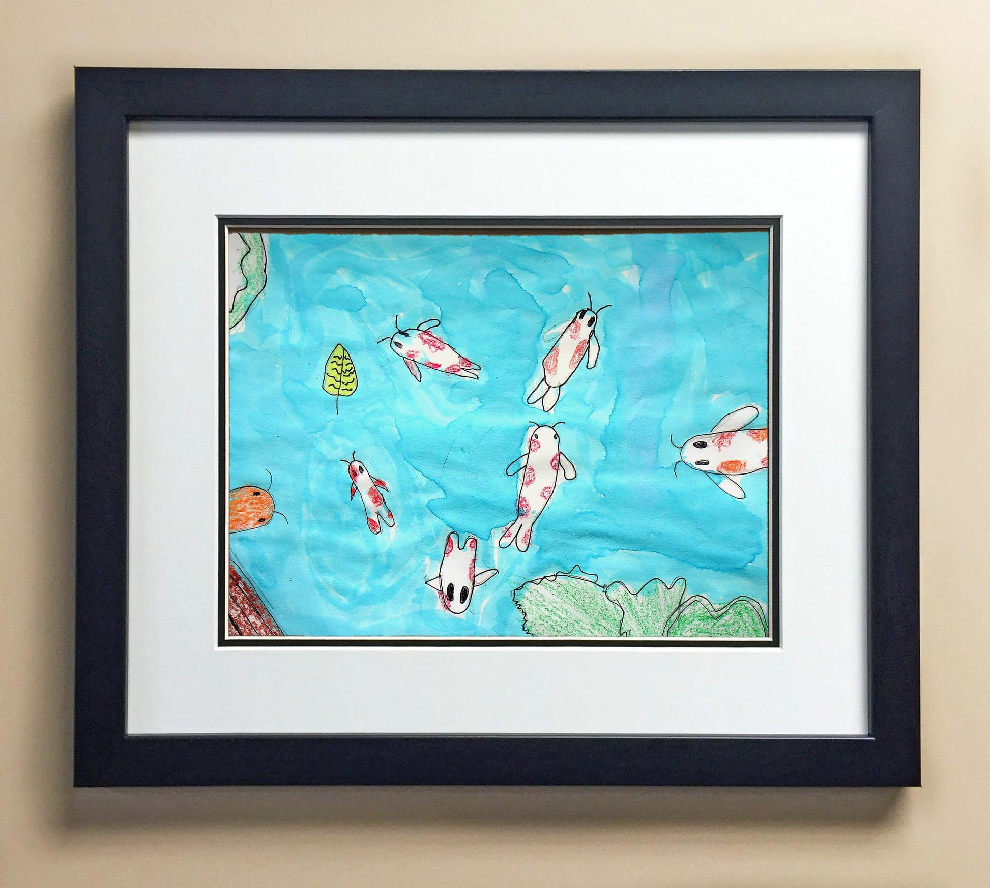 Included with the purchase is the Students Artwork, Frame, double matboard, shatter proof plexiglass, and a ready to hang backerboard with turnbuttons