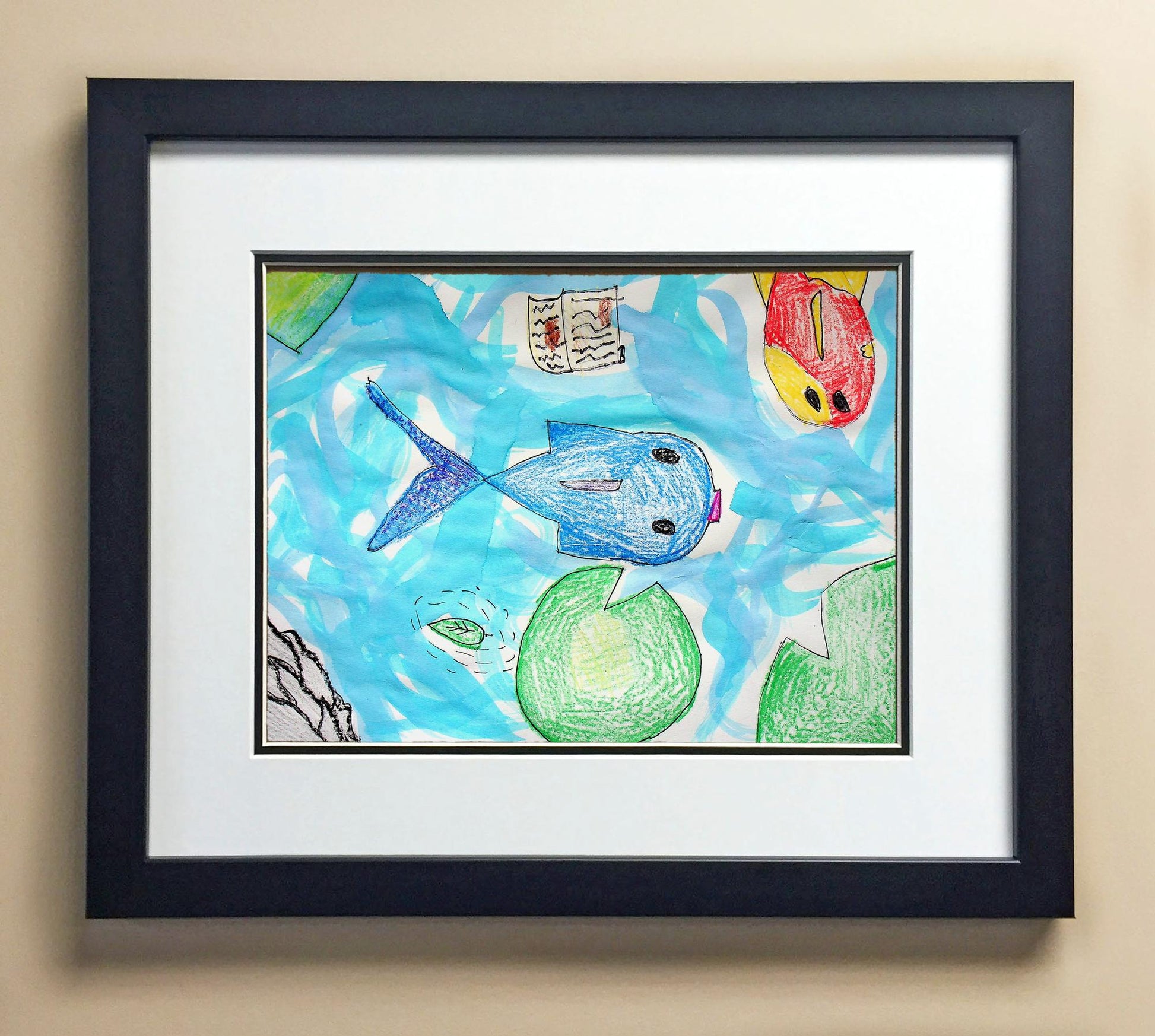 Included with the purchase is the Students Artwork, Frame, double matboard, shatter proof plexiglass, and a ready to hang backerboard with turnbuttons