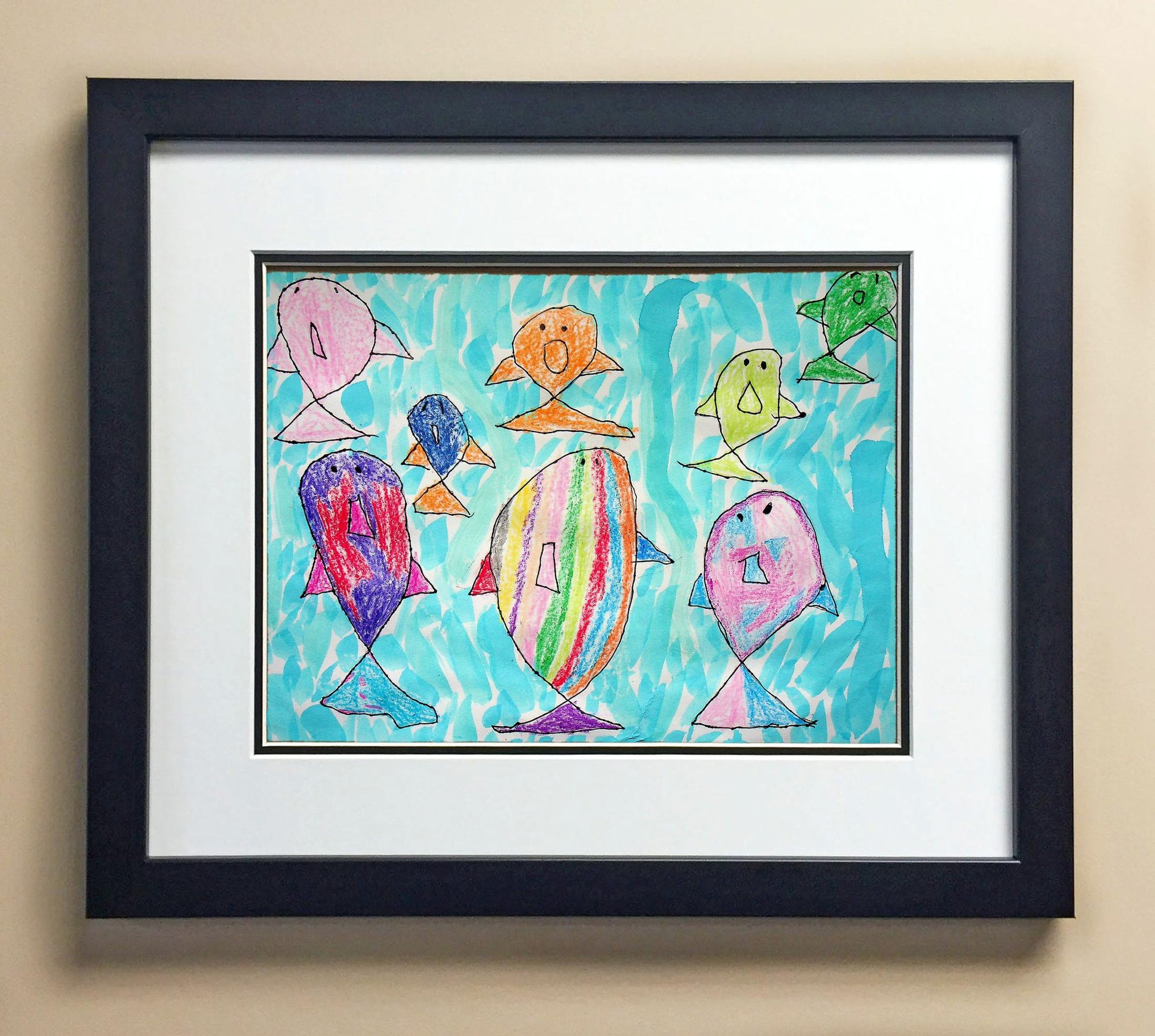 Included with the purchase is the Students Artwork, Frame, double matboard, shatter proof plexiglass, and a ready to hang backerboard with turnbuttons