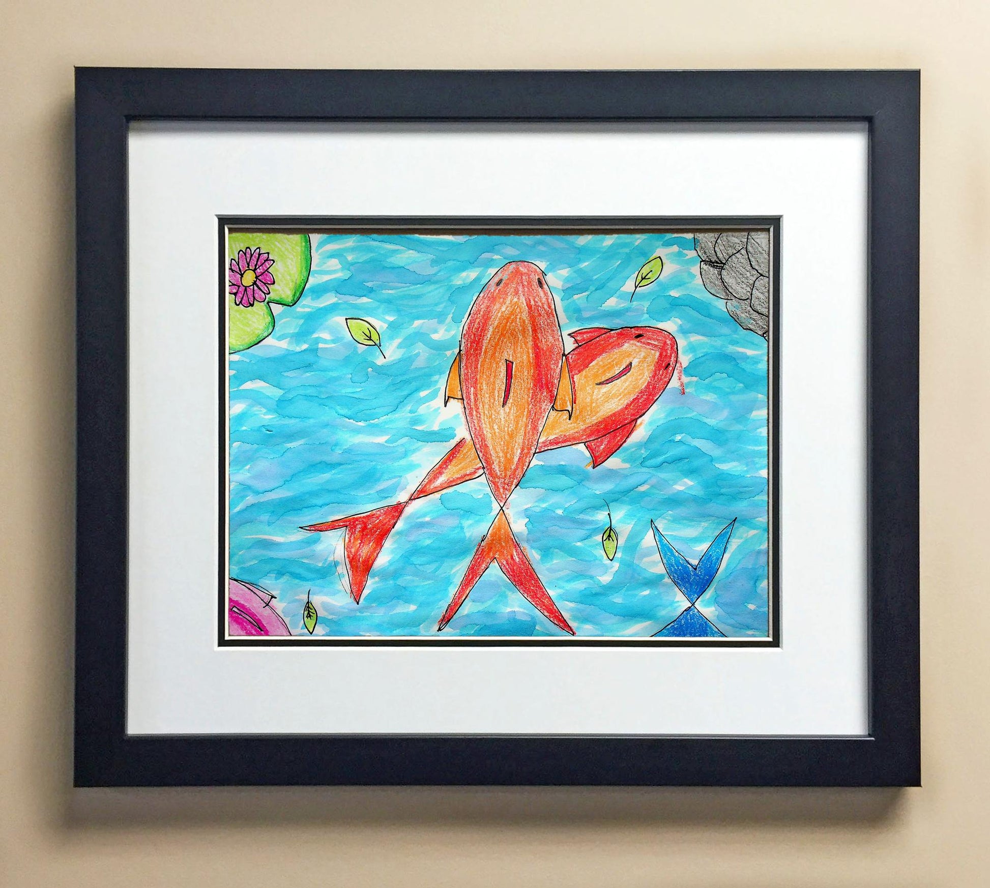 Included with the purchase is the Students Artwork, Frame, double matboard, shatter proof plexiglass, and a ready to hang backerboard with turnbuttons