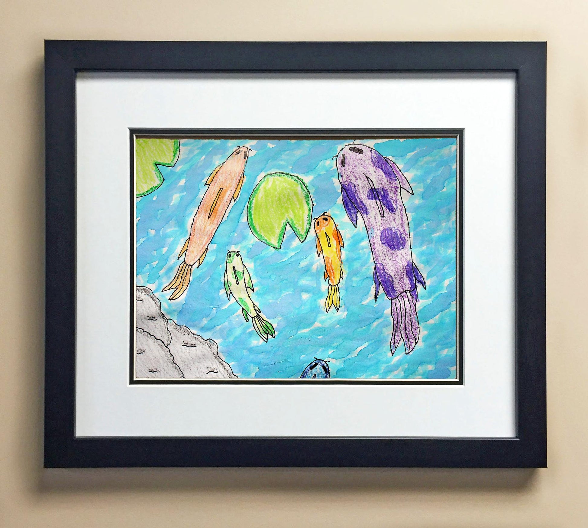 Included with the purchase is the Students Artwork, Frame, double matboard, shatter proof plexiglass, and a ready to hang backerboard with turnbuttons