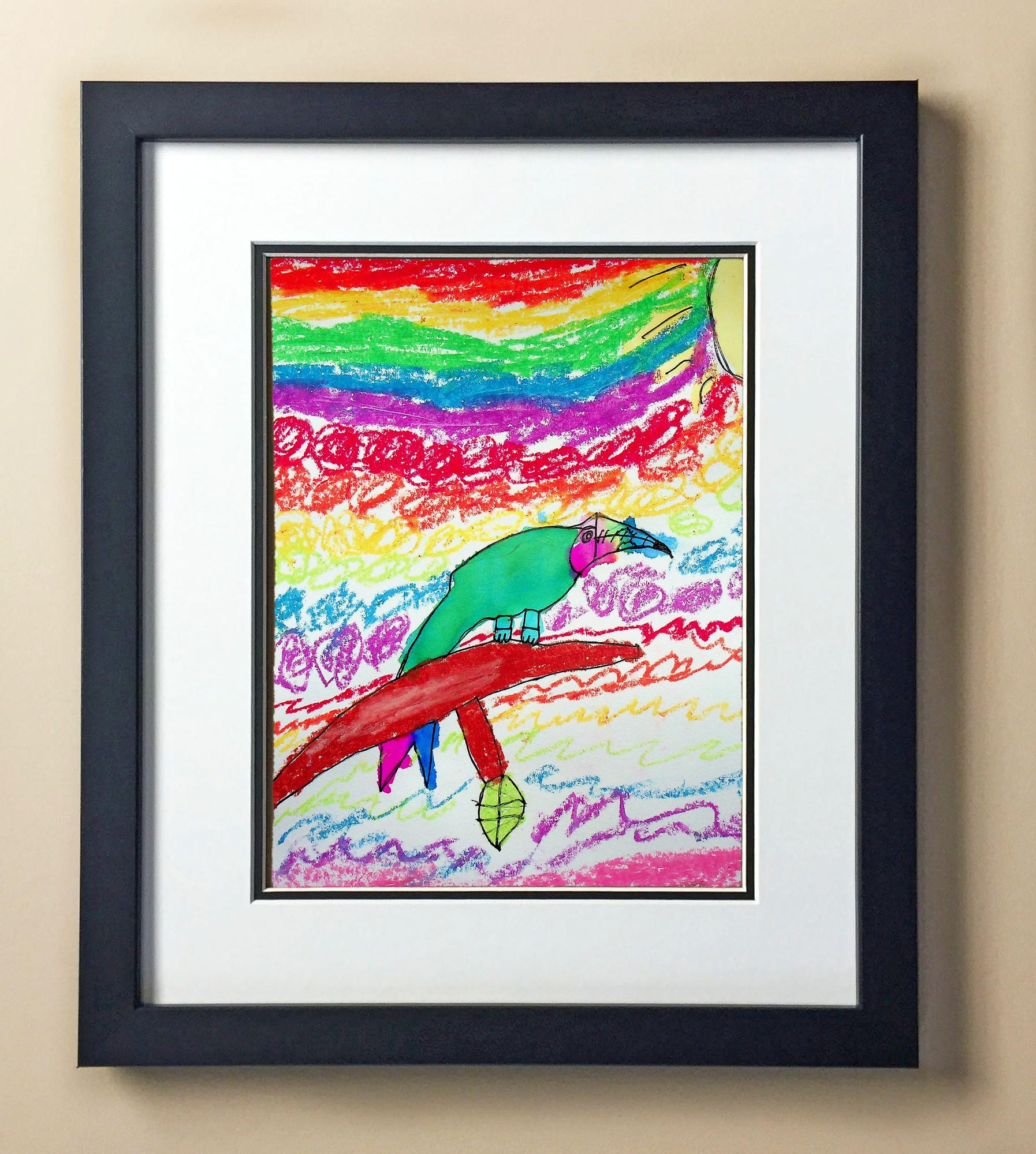 Included with the purchase is the Students Artwork, Frame, double matboard, shatter proof plexiglass, and a ready to hang backerboard with turnbuttons