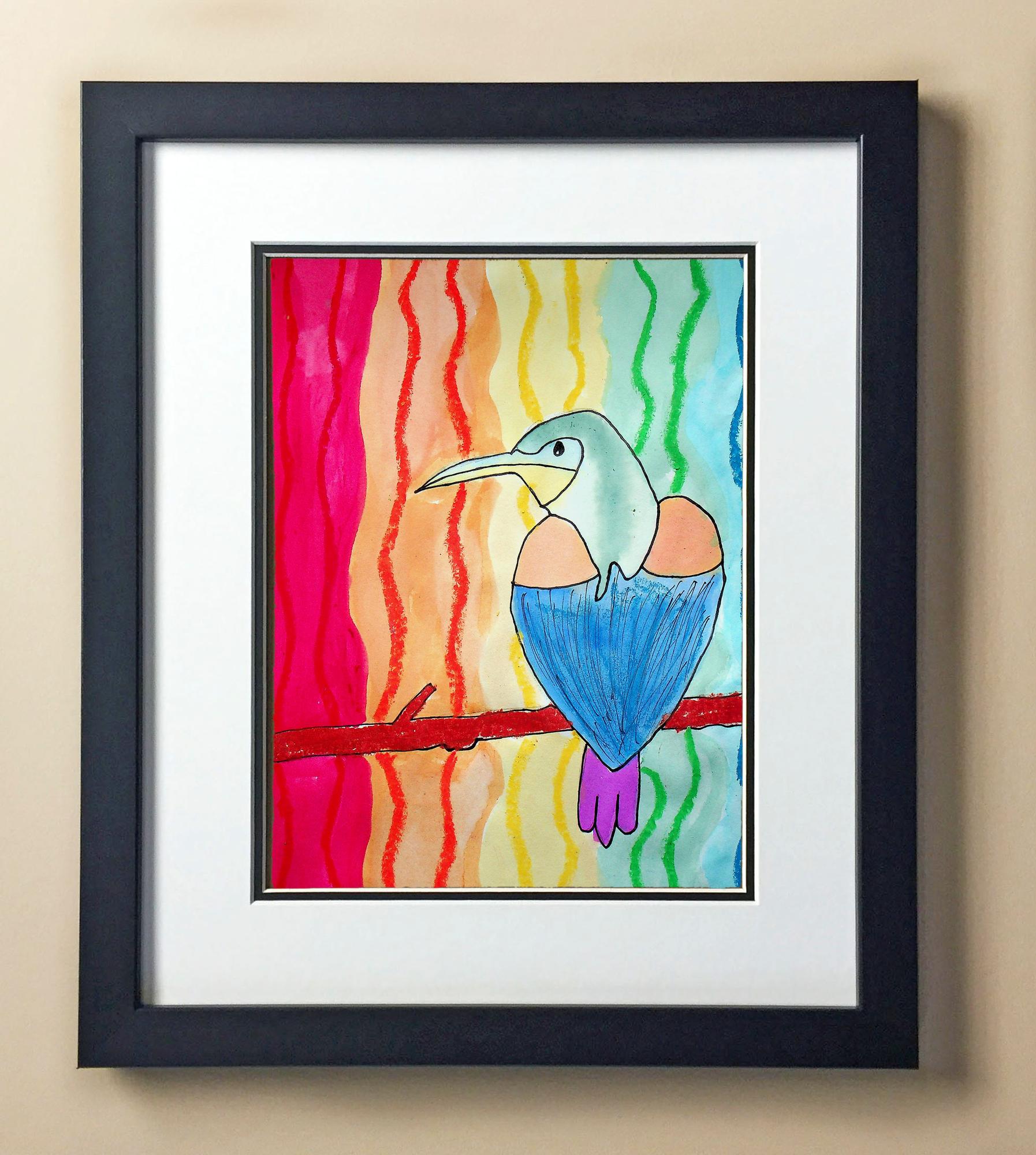 Included with the purchase is the Students Artwork, Frame, double matboard, shatter proof plexiglass, and a ready to hang backerboard with turnbuttons