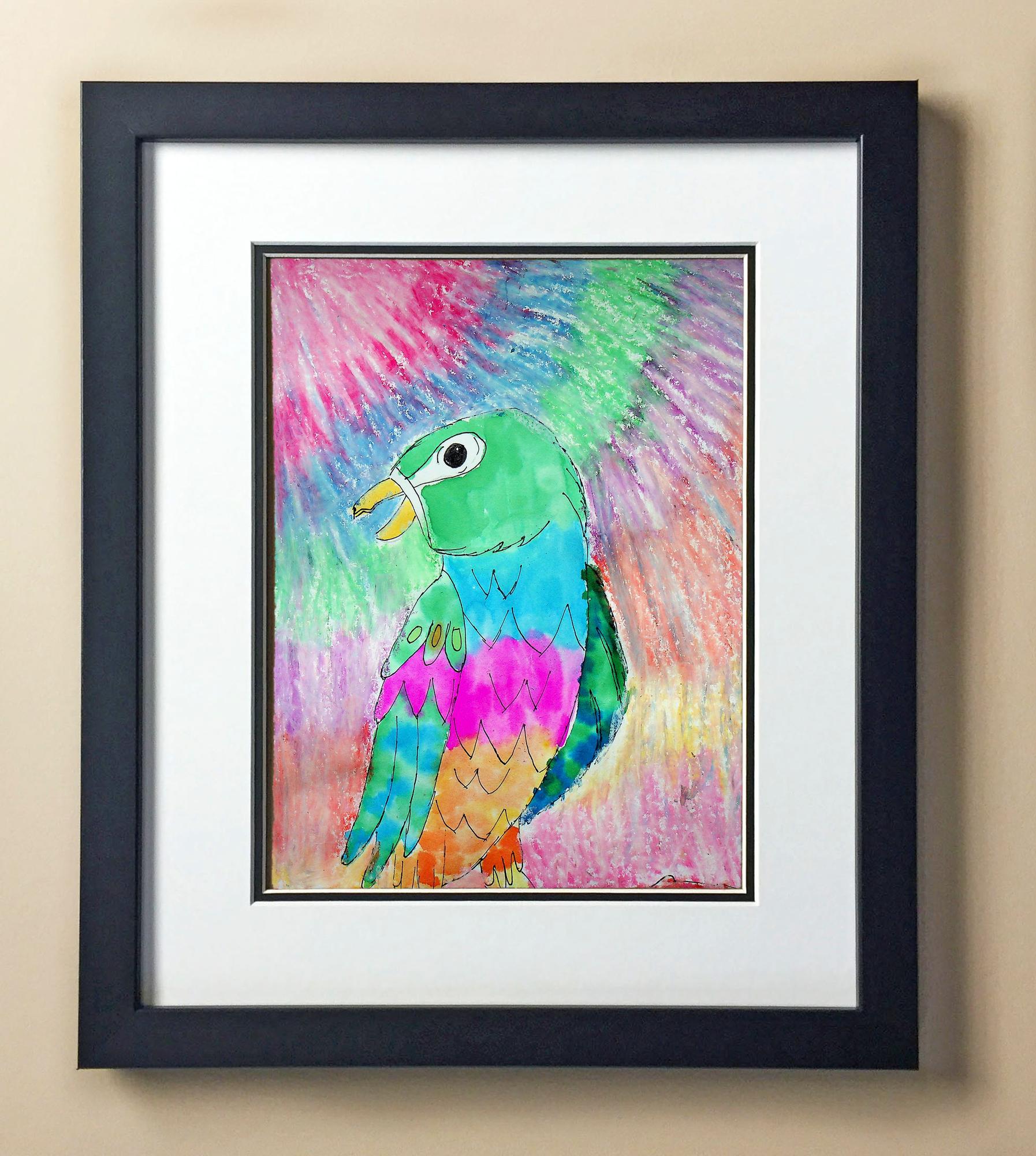 Included with the purchase is the Students Artwork, Frame, double matboard, shatter proof plexiglass, and a ready to hang backerboard with turnbuttons
