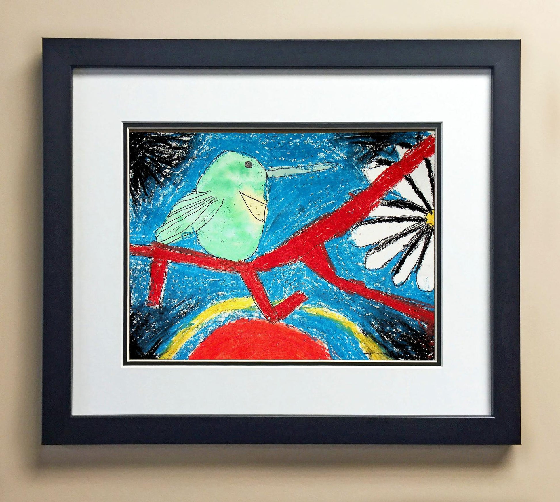 Included with the purchase is the Students Artwork, Frame, double matboard, shatter proof plexiglass, and a ready to hang backerboard with turnbuttons