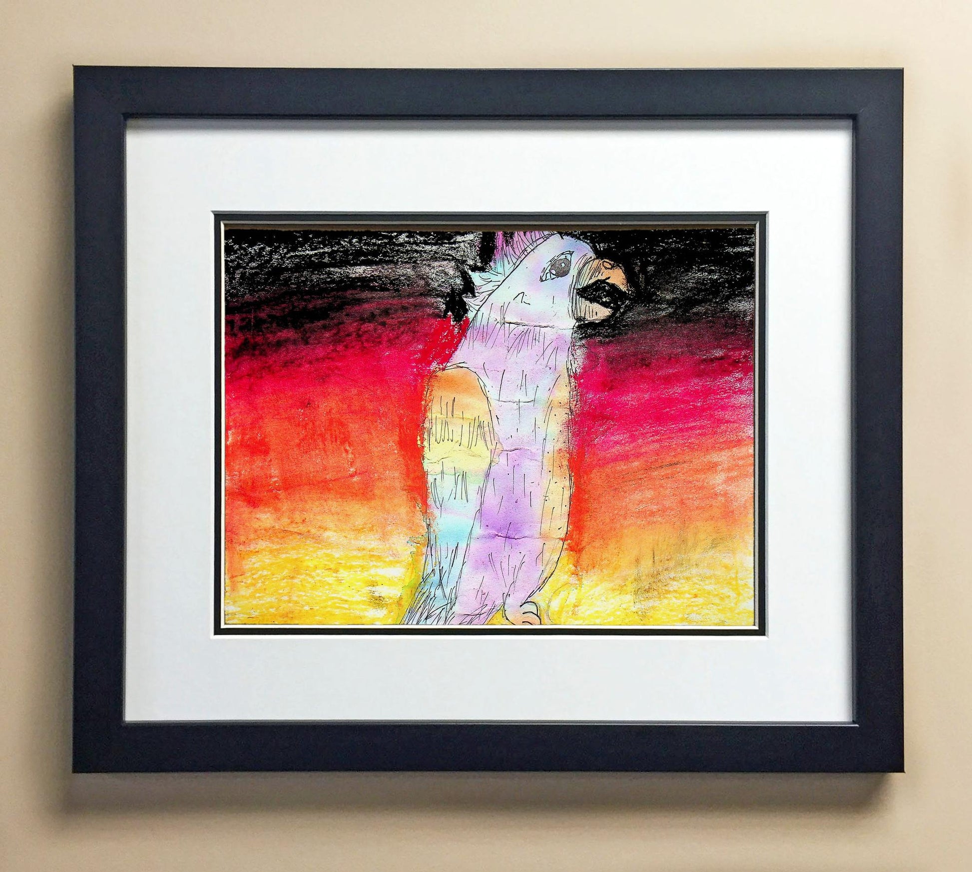 Included with the purchase is the Students Artwork, Frame, double matboard, shatter proof plexiglass, and a ready to hang backerboard with turnbuttons
