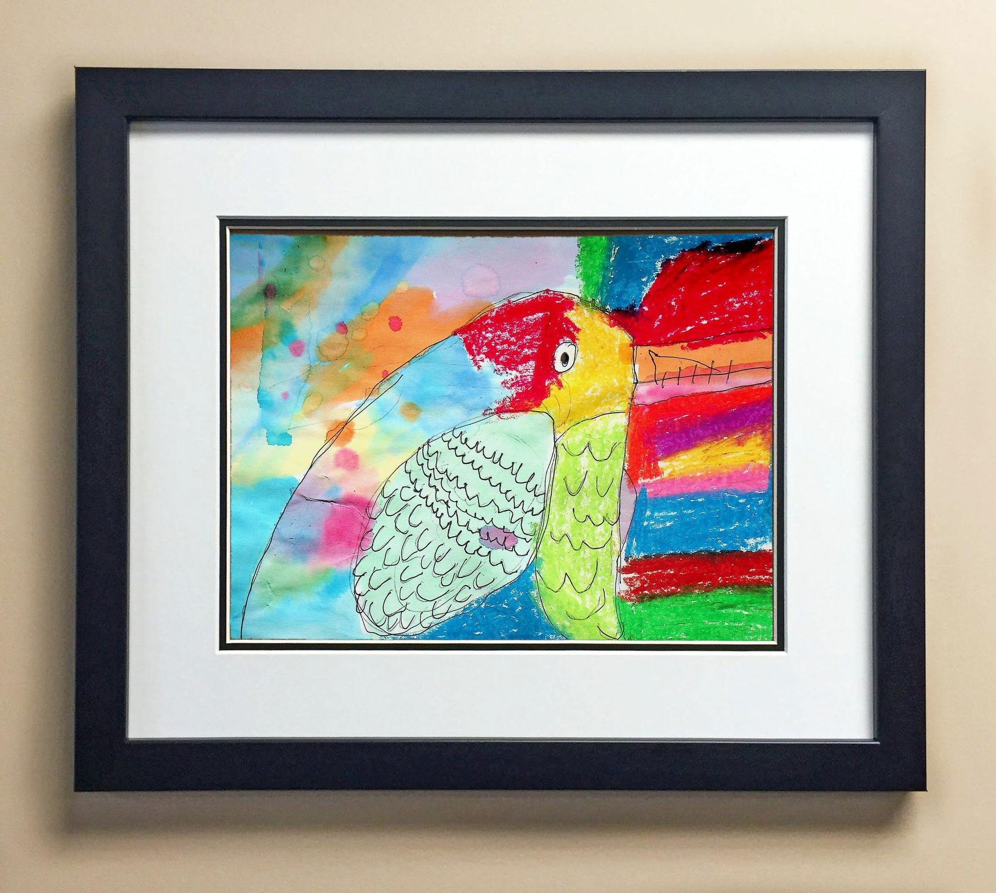 Included with the purchase is the Students Artwork, Frame, double matboard, shatter proof plexiglass, and a ready to hang backerboard with turnbuttons