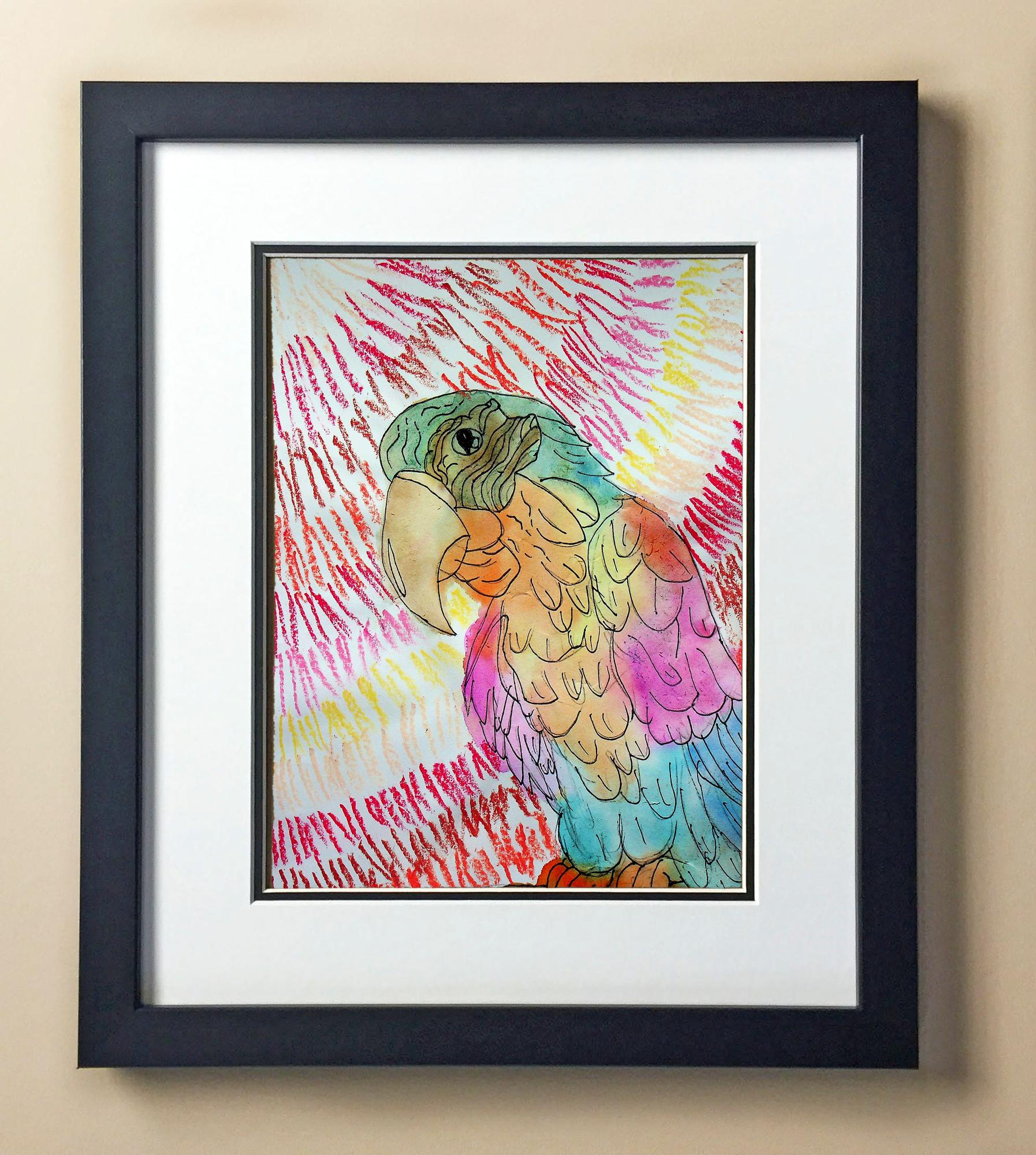 Included with the purchase is the Students Artwork, Frame, double matboard, shatter proof plexiglass, and a ready to hang backerboard with turnbuttons