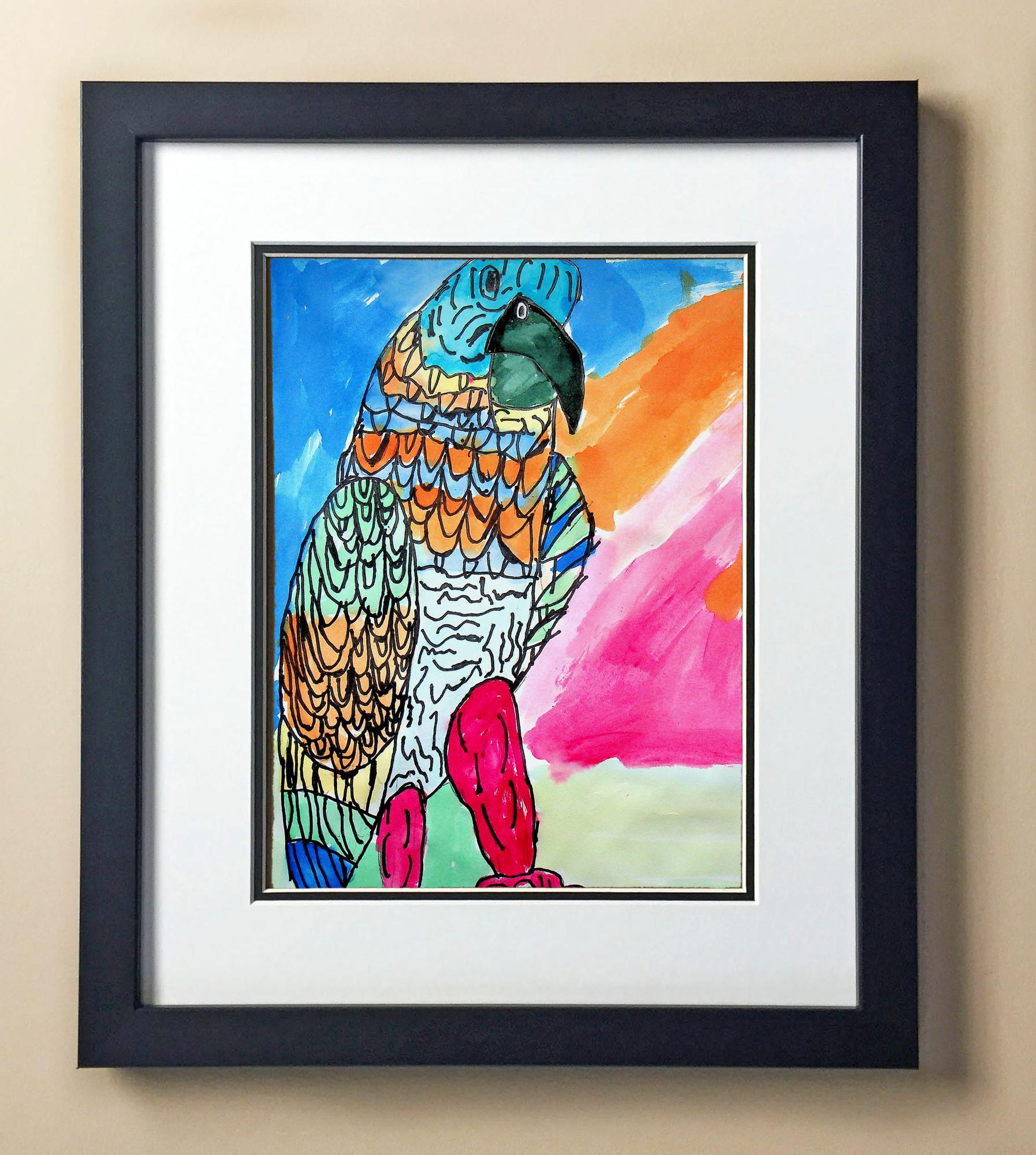 Included with the purchase is the Students Artwork, Frame, double matboard, shatter proof plexiglass, and a ready to hang backerboard with turnbuttons