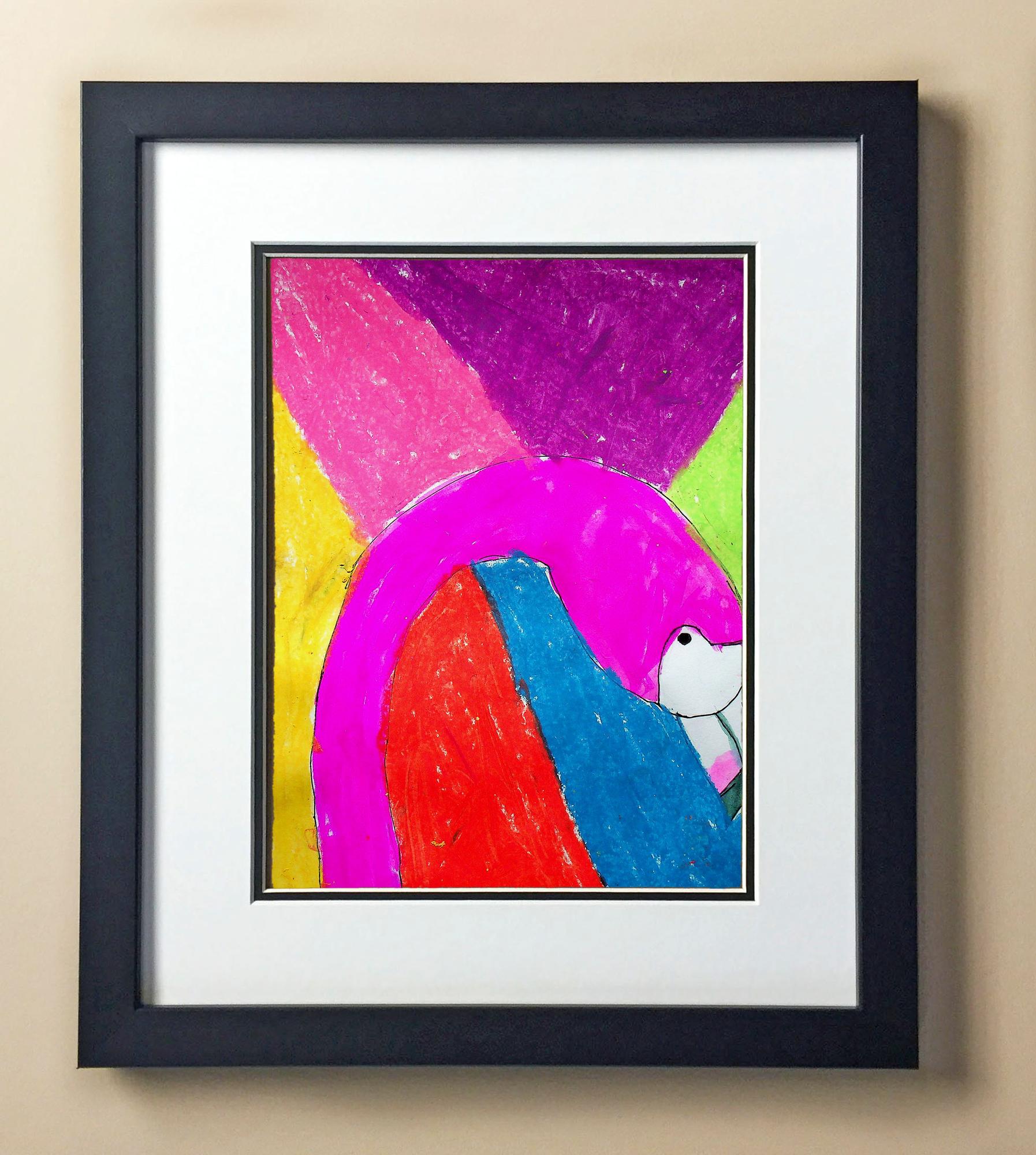 Included with the purchase is the Students Artwork, Frame, double matboard, shatter proof plexiglass, and a ready to hang backerboard with turnbuttons