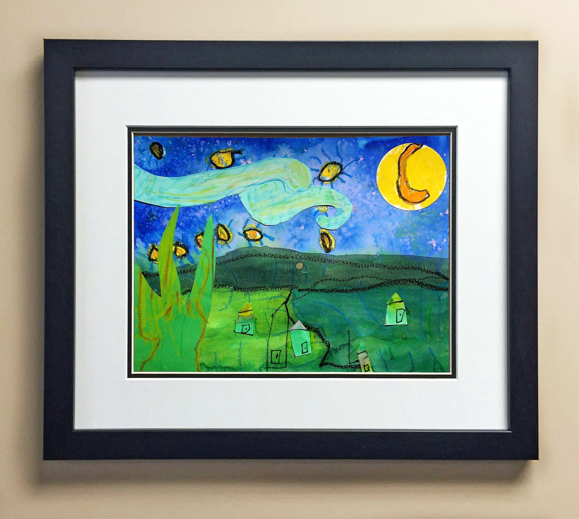 Included with the purchase is the Students Artwork, Frame, double matboard, shatter proof plexiglass, and a ready to hang backerboard with turnbuttons