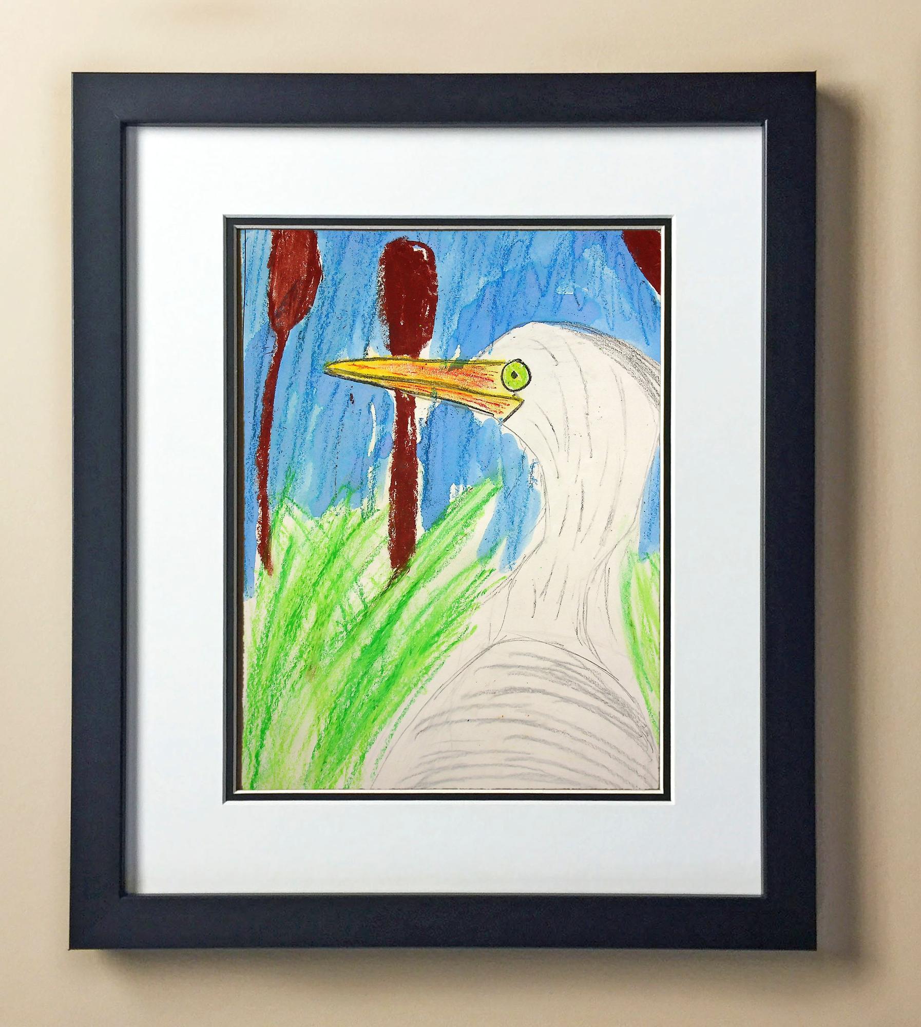 Included with the purchase is the Students Artwork, Frame, double matboard, shatter proof plexiglass, and a ready to hang backerboard with turnbuttons