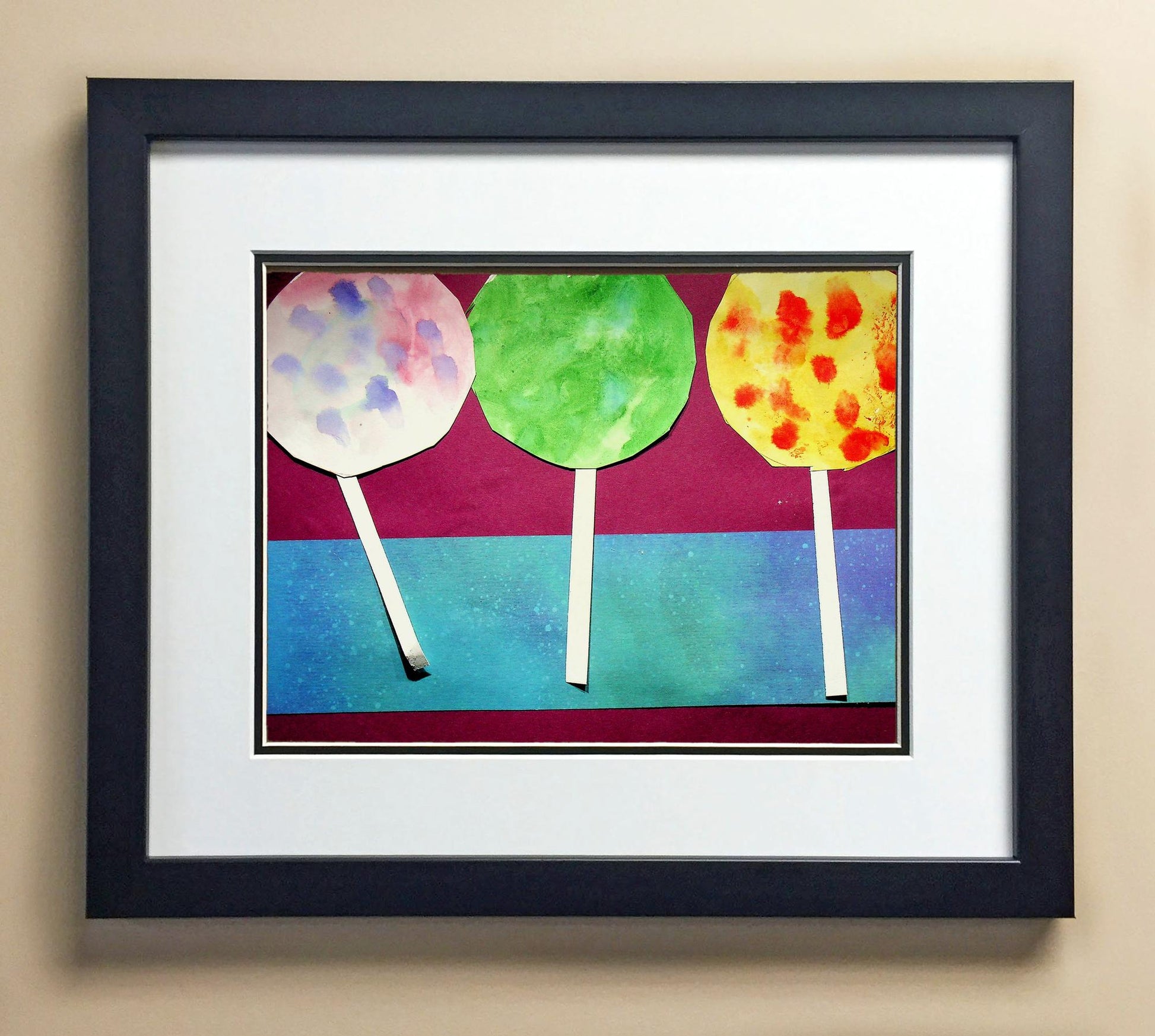 Included with the purchase is the Students Artwork, Frame, double matboard, shatter proof plexiglass, and a ready to hang backerboard with turnbuttons