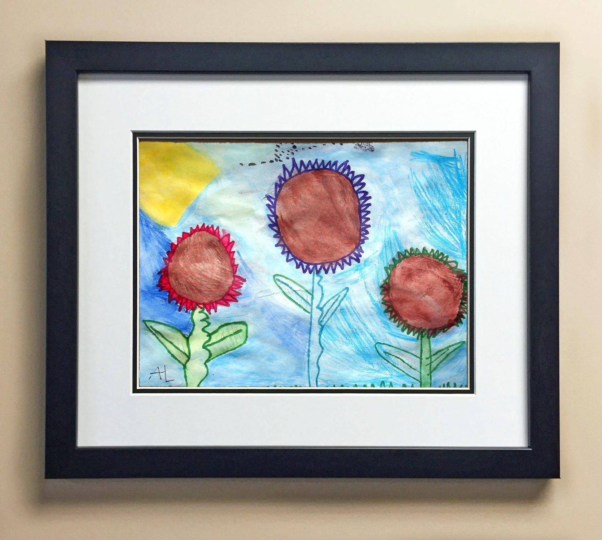 Included with the purchase is the Students Artwork, Frame, double matboard, shatter proof plexiglass, and a ready to hang backerboard with turnbuttons