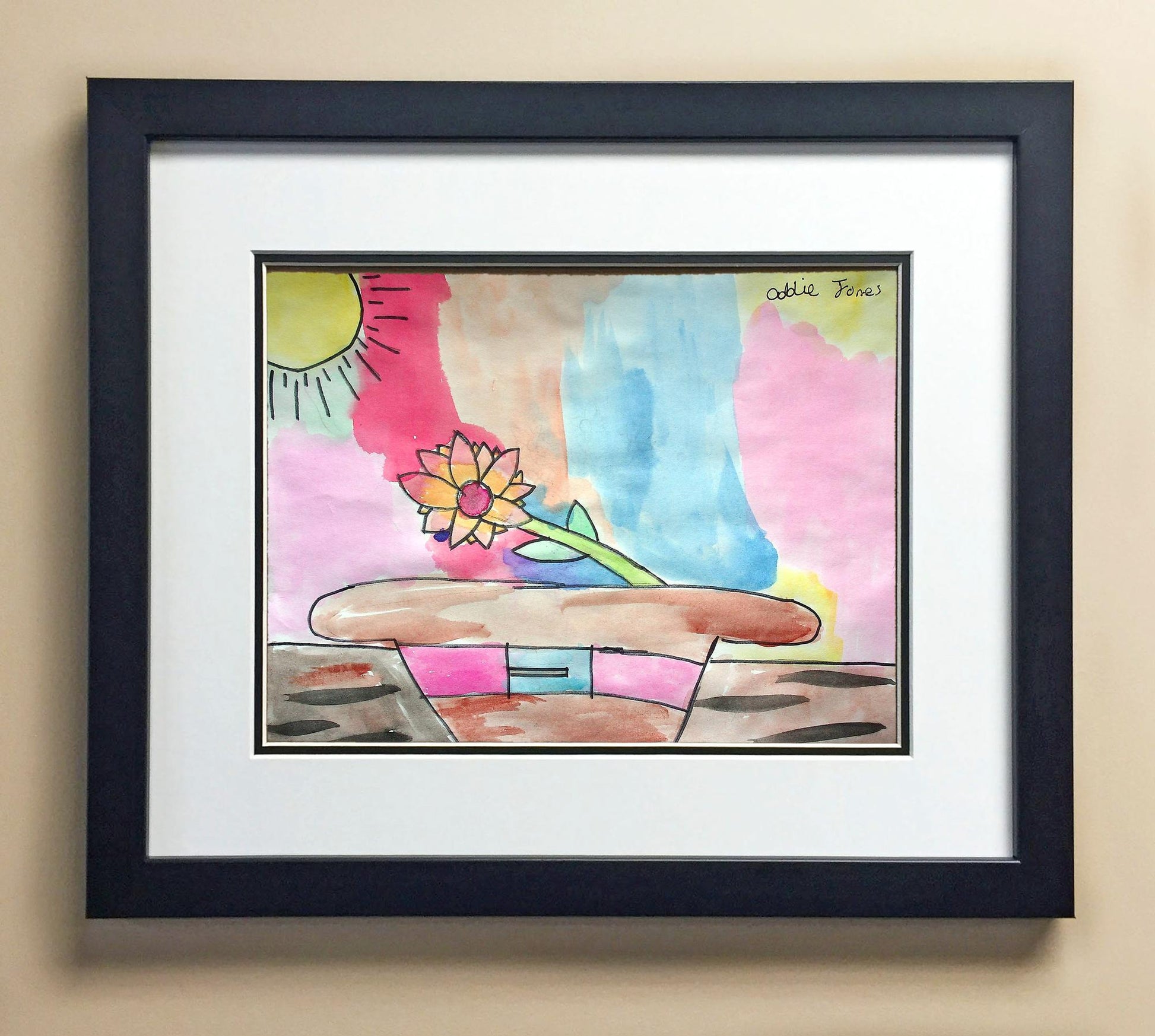 Included with the purchase is the Students Artwork, Frame, double matboard, shatter proof plexiglass, and a ready to hang backerboard with turnbuttons