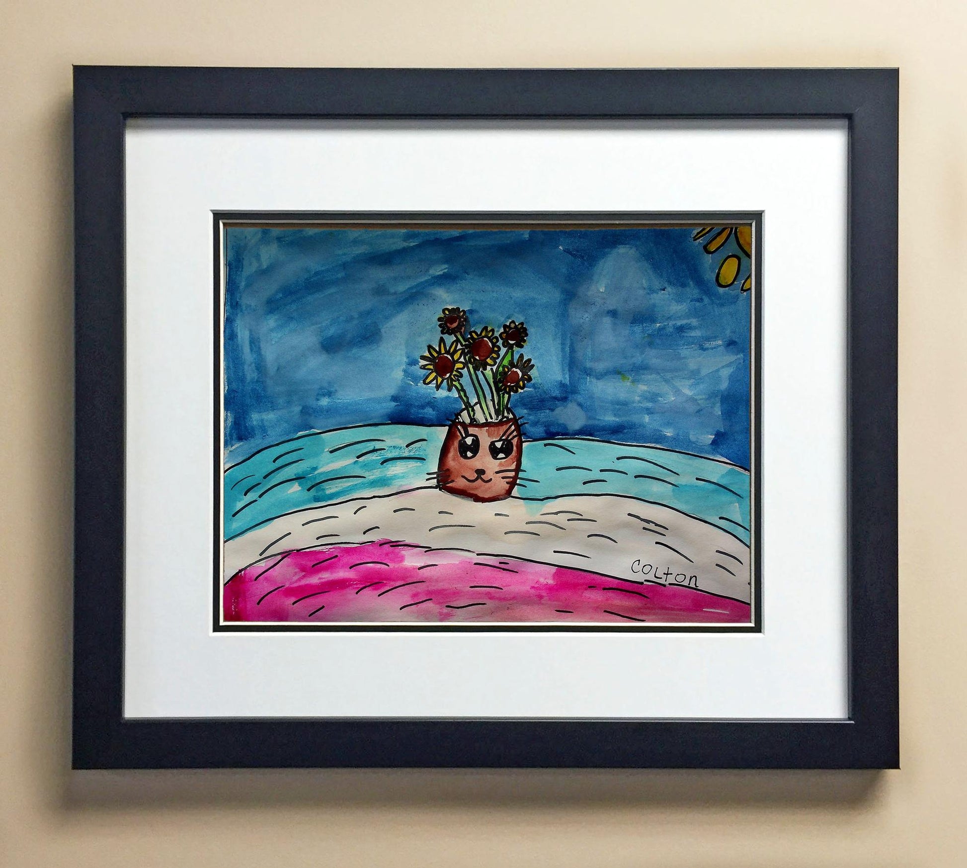 Included with the purchase is the Students Artwork, Frame, double matboard, shatter proof plexiglass, and a ready to hang backerboard with turnbuttons