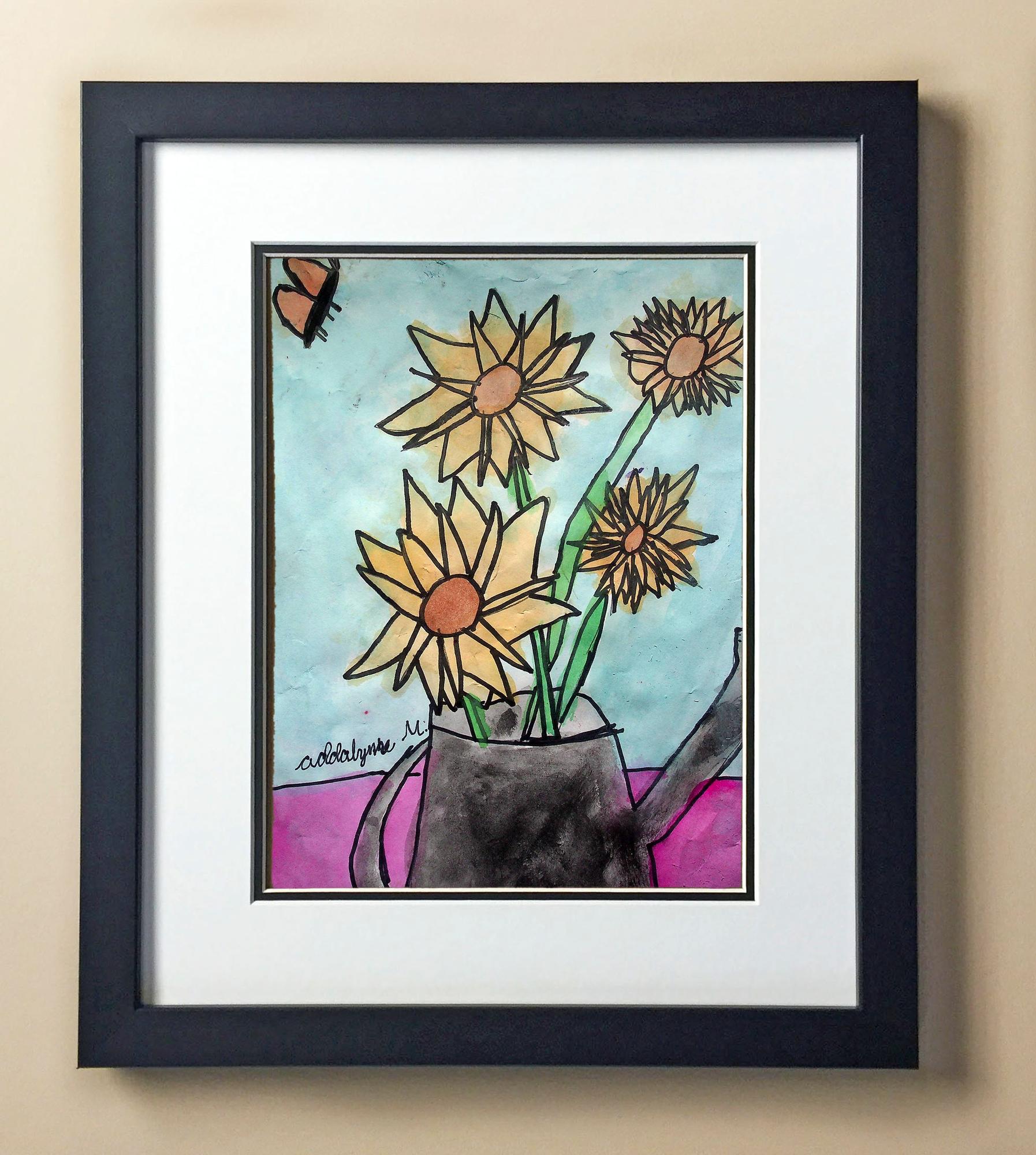 Included with the purchase is the Students Artwork, Frame, double matboard, shatter proof plexiglass, and a ready to hang backerboard with turnbuttons