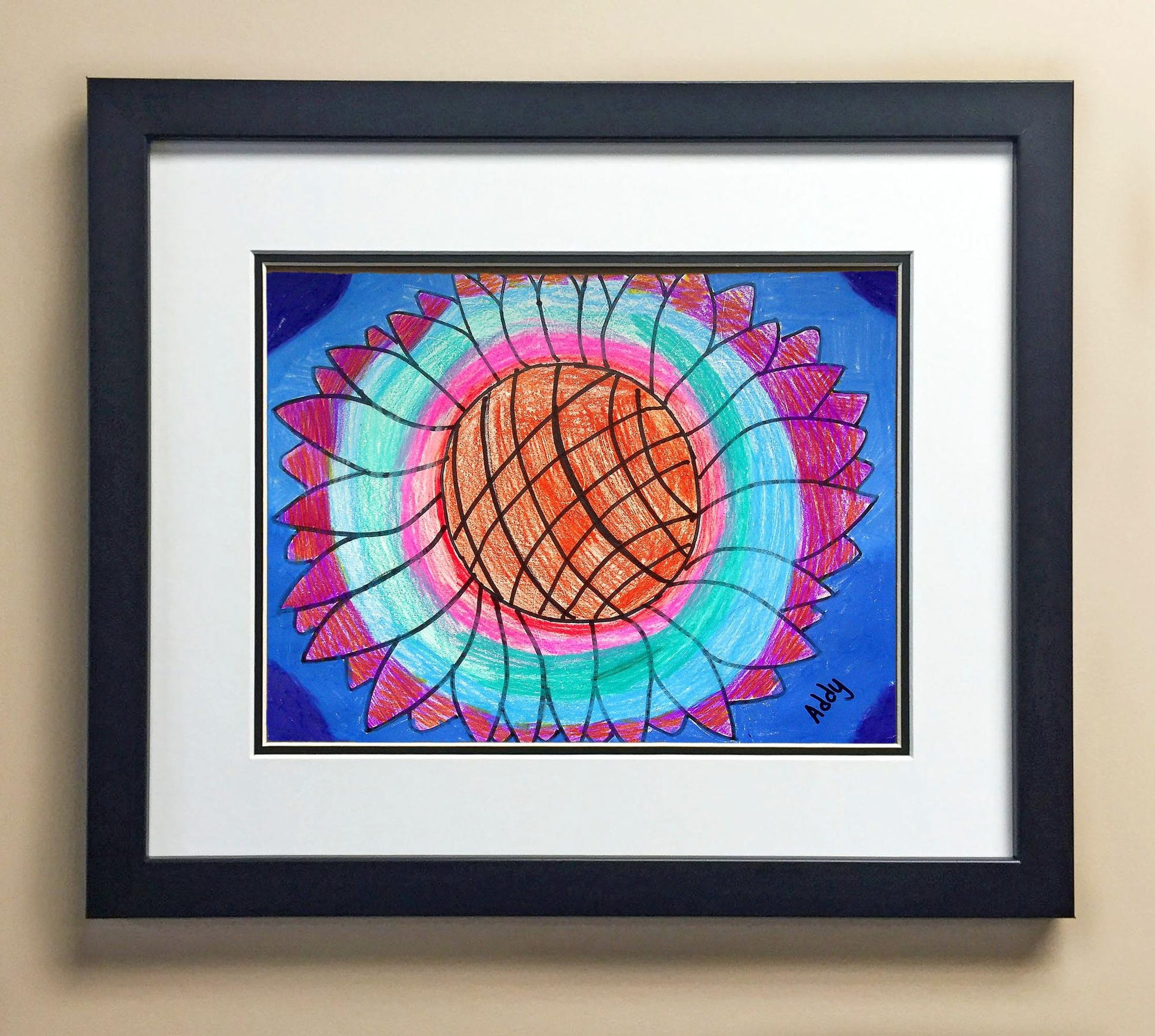 Included with the purchase is the Students Artwork, Frame, double matboard, shatter proof plexiglass, and a ready to hang backerboard with turnbuttons