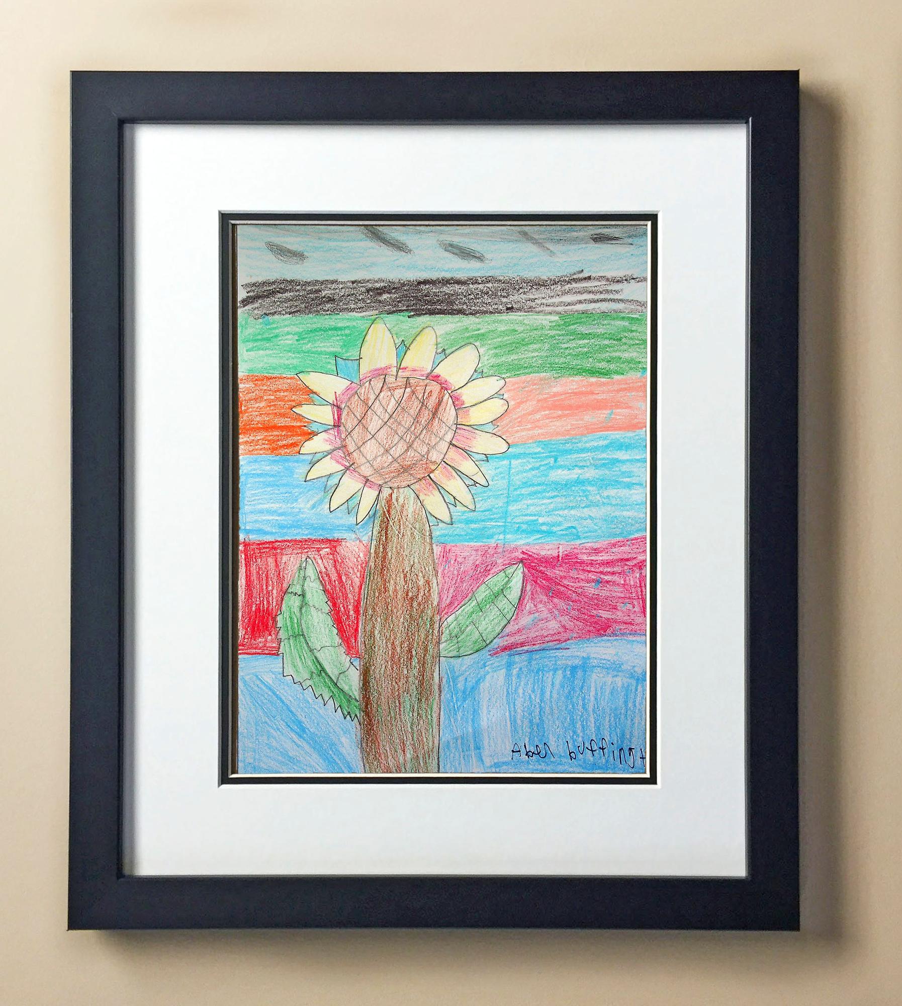 Included with the purchase is the Students Artwork, Frame, double matboard, shatter proof plexiglass, and a ready to hang backerboard with turnbuttons