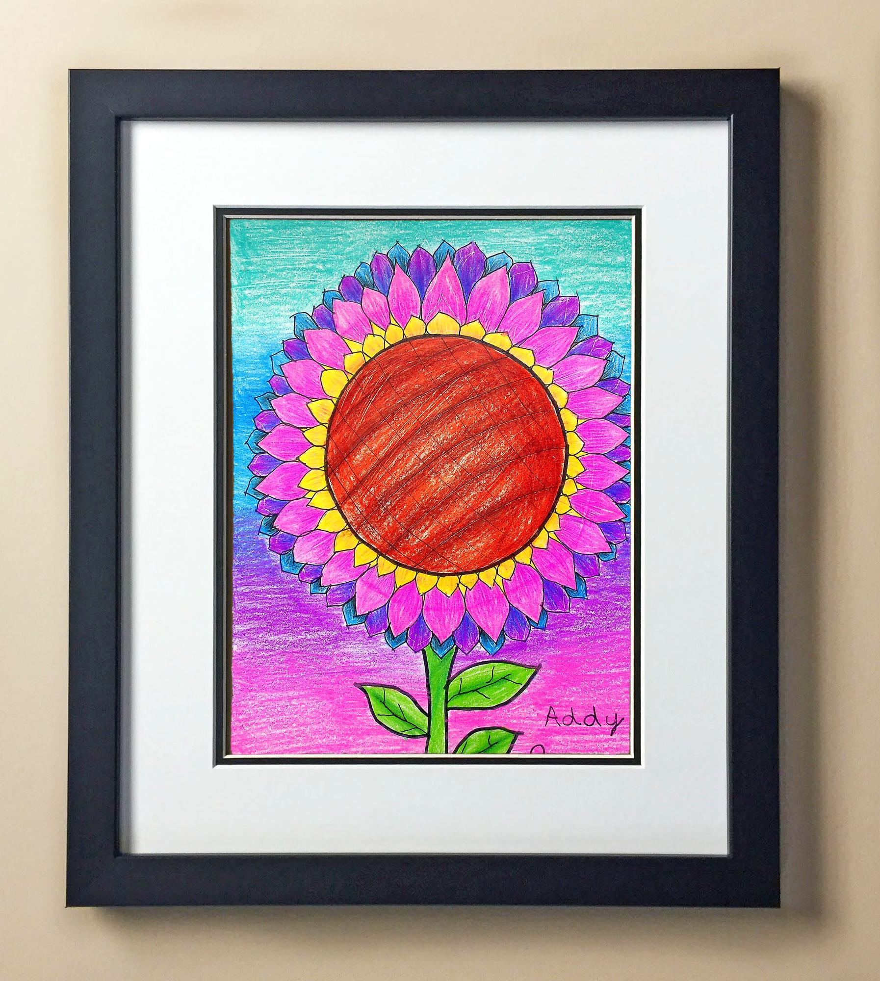 Included with the purchase is the Students Artwork, Frame, double matboard, shatter proof plexiglass, and a ready to hang backerboard with turnbuttons