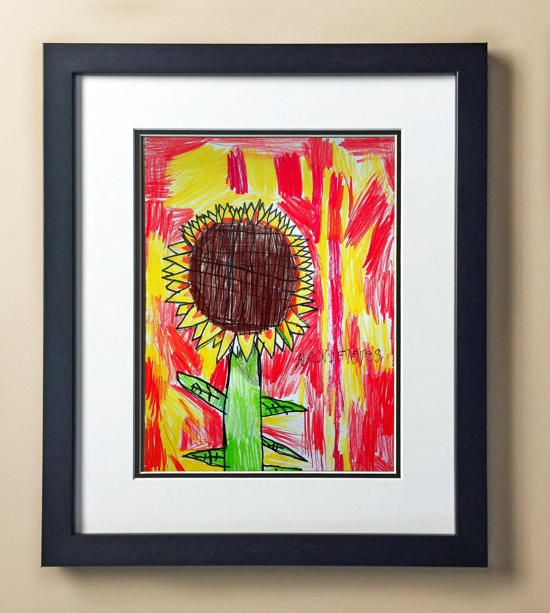 Included with the purchase is the Students Artwork, Frame, double matboard, shatter proof plexiglass, and a ready to hang backerboard with turnbuttons