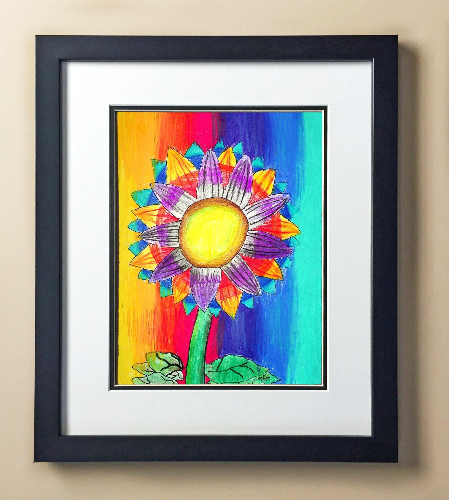 Included with the purchase is the Students Artwork, Frame, double matboard, shatter proof plexiglass, and a ready to hang backerboard with turnbuttons