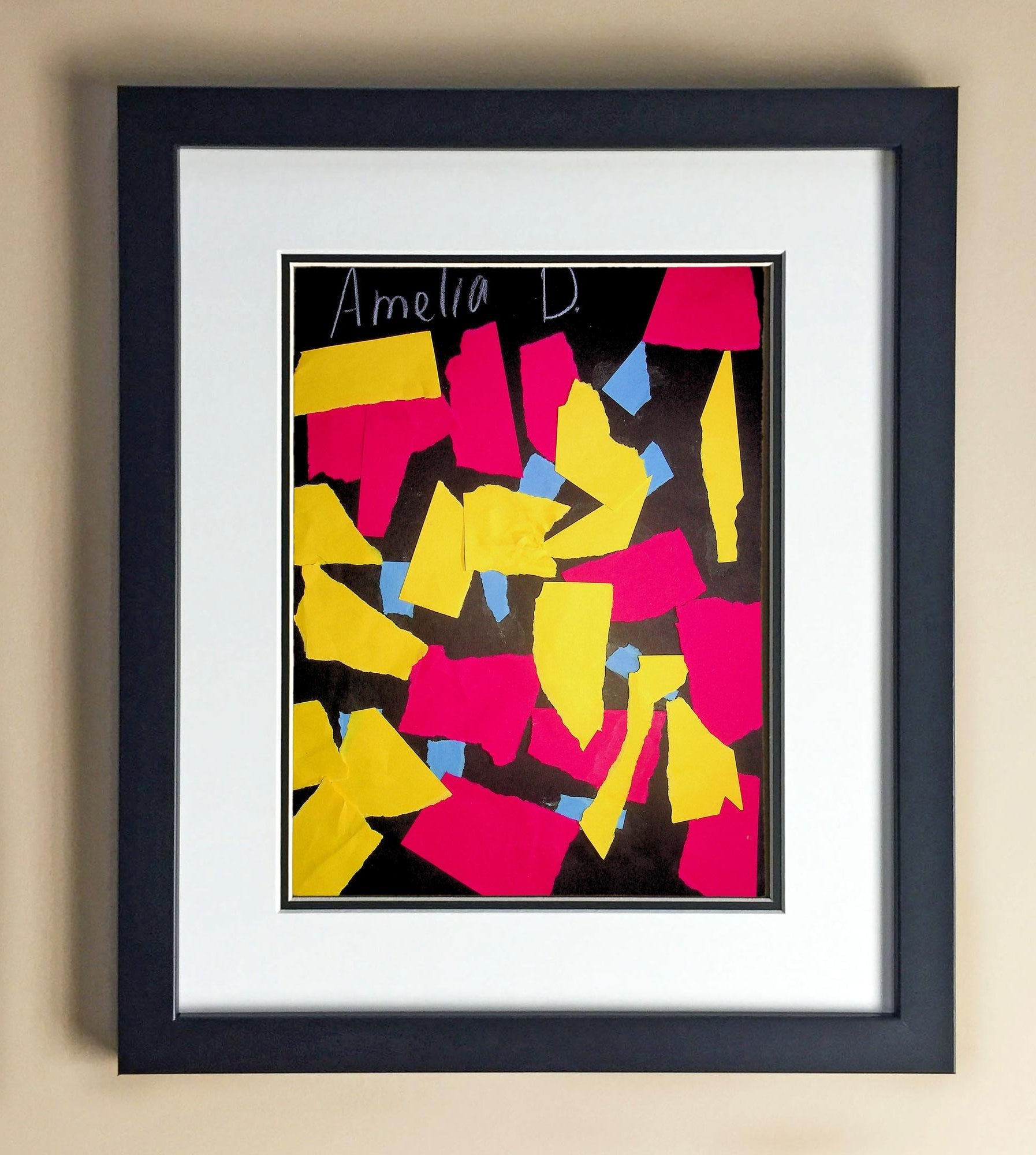 Included with the purchase is the Students Artwork, Frame, double matboard, shatter proof plexiglass, and a ready to hang backerboard with turnbuttons