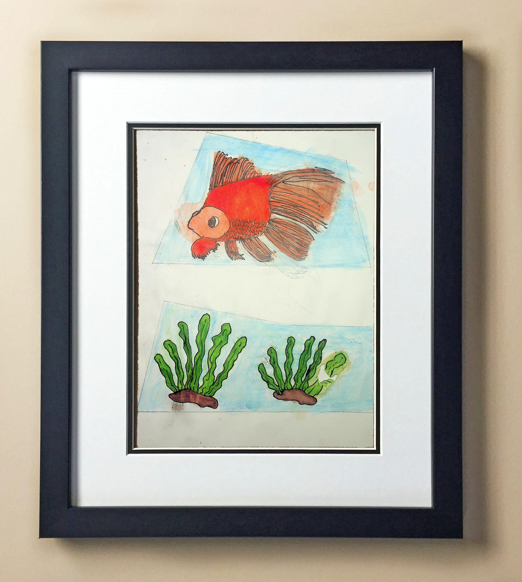 Included with the purchase is the Students Artwork, Frame, double matboard, shatter proof plexiglass, and a ready to hang backerboard with turnbuttons