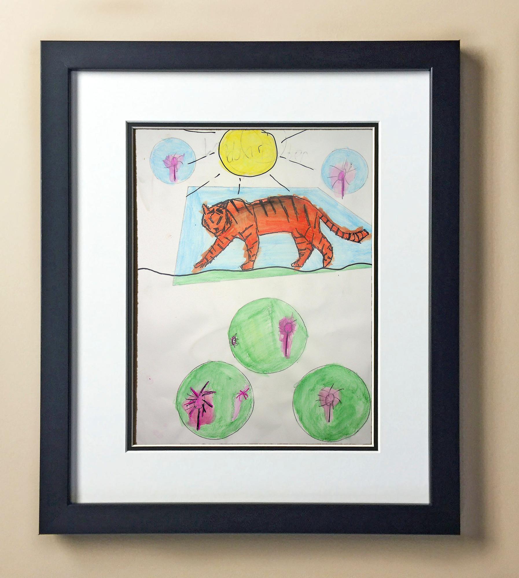Included with the purchase is the Students Artwork, Frame, double matboard, shatter proof plexiglass, and a ready to hang backerboard with turnbuttons