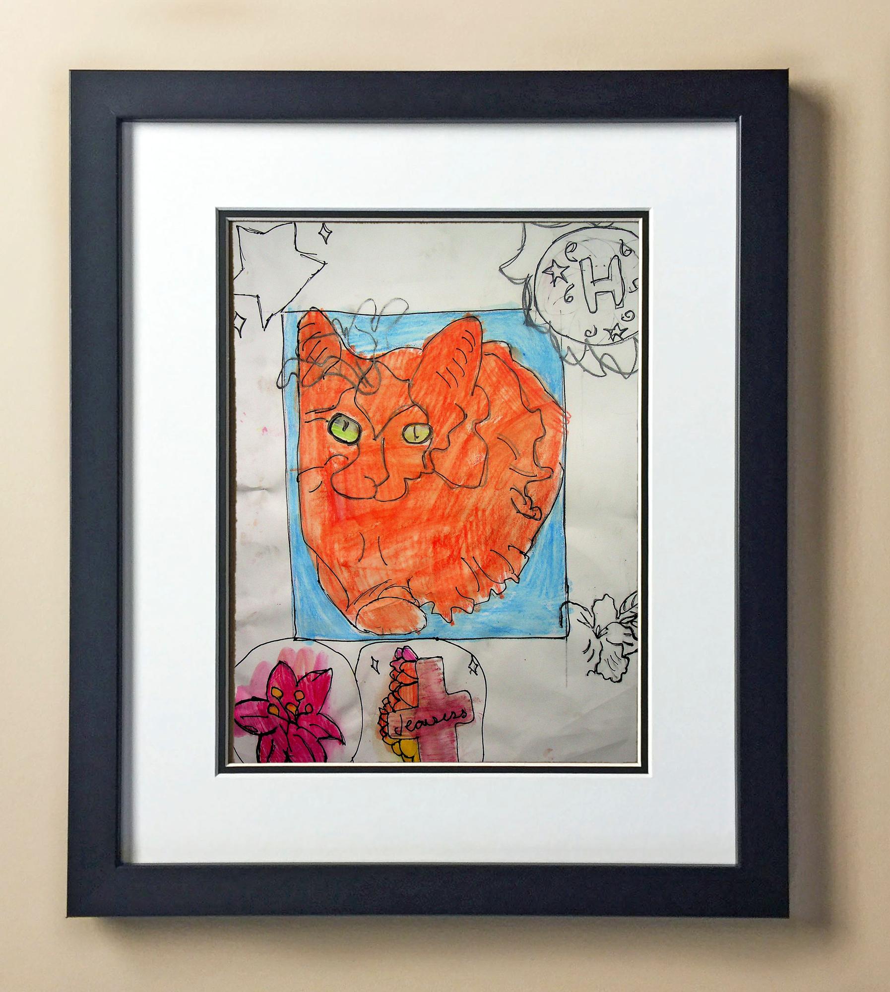 Included with the purchase is the Students Artwork, Frame, double matboard, shatter proof plexiglass, and a ready to hang backerboard with turnbuttons