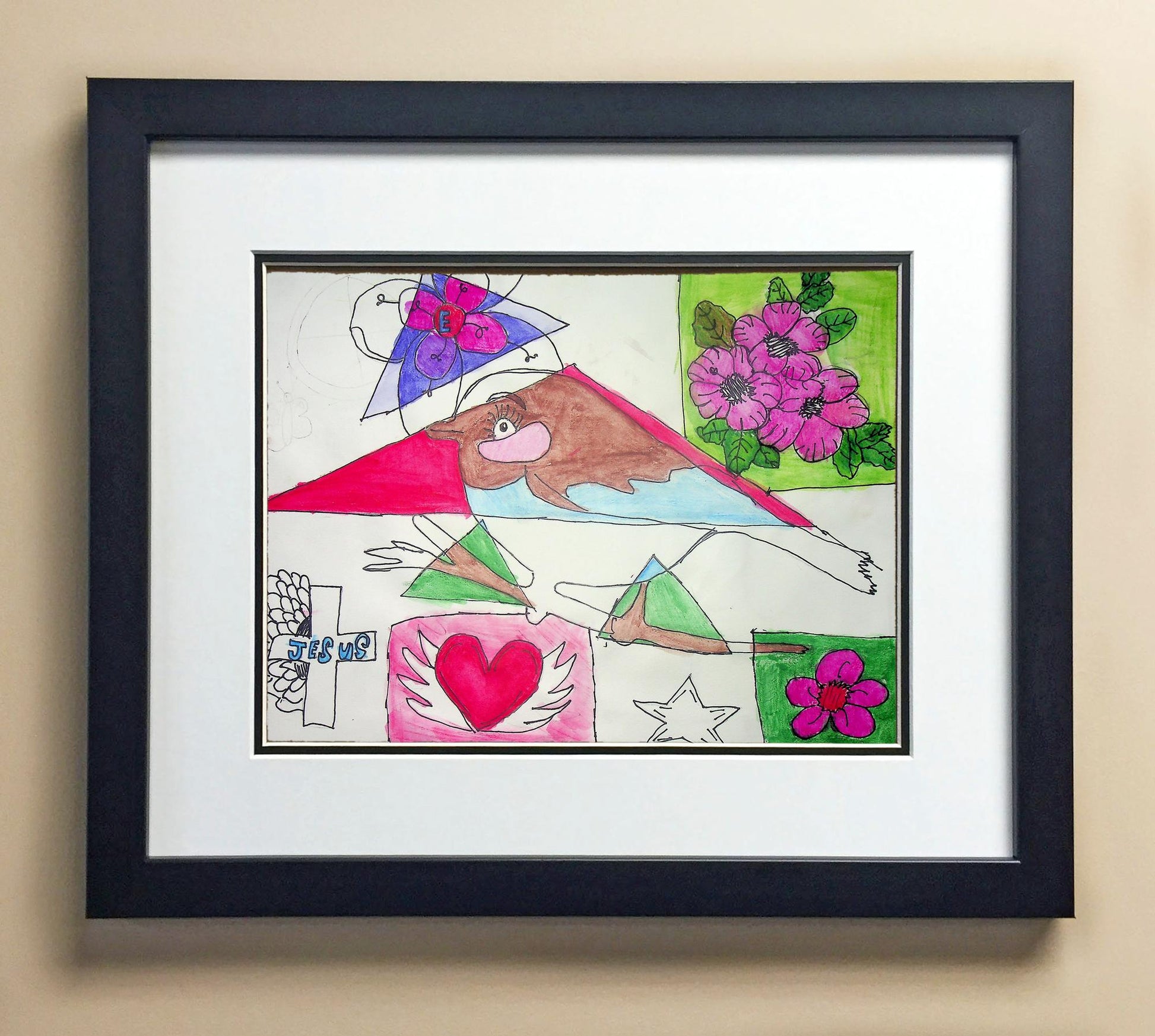 Included with the purchase is the Students Artwork, Frame, double matboard, shatter proof plexiglass, and a ready to hang backerboard with turnbuttons